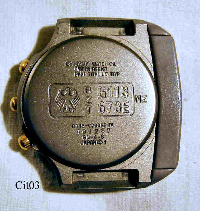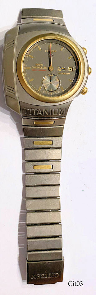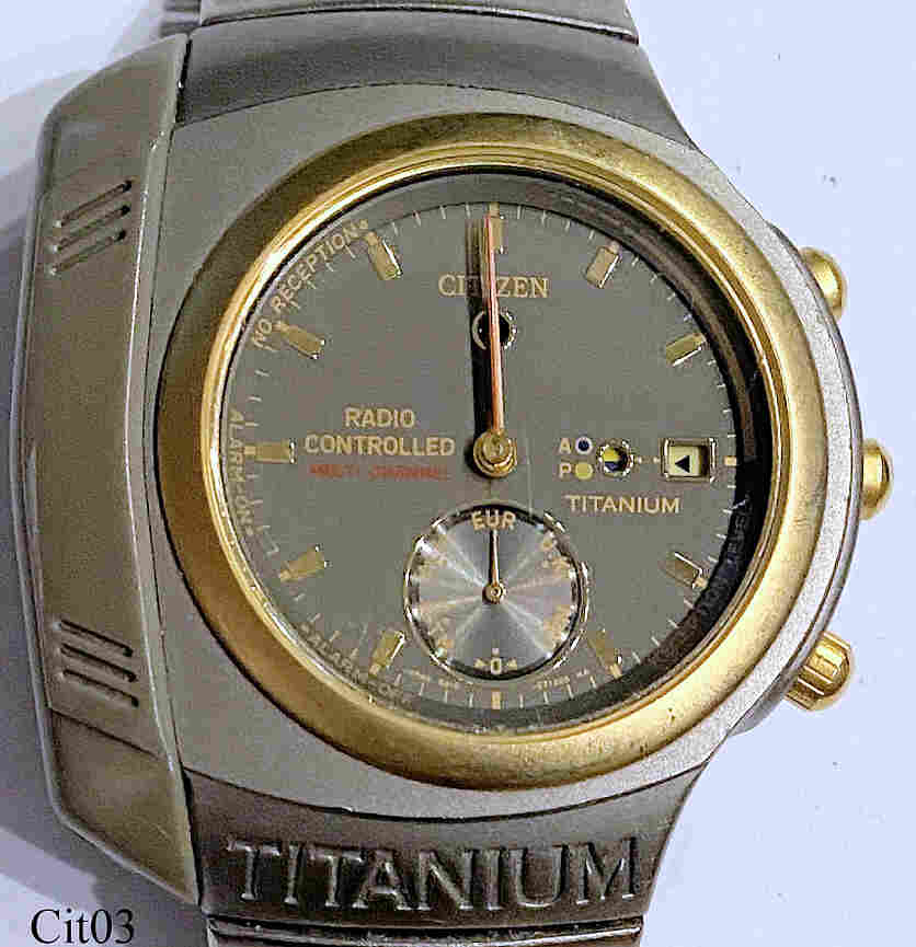 Dies ist eine Citizen Radio Controlled Titan Uhr, Citizen Caliber 8415, Referenz Nr.: C70082TA, Beschriftet: ”CITIZEN, Radio Controlled, Titanium, Multi Channel ”, Rückseite: ”Citizen, Watch Co., Waterresist, Base Titanium Tiyp, BZT G133 673E, 8415 - C70082TA, 401287, GN-4-8, Japan -> 1”, innen: “Nine Jewels, Japan, Citizen Watch Co., 8415M, 280206”. Titan Gehäuse, Datum bei der 3. Diese Uhr wird in Deutschland durch den Zeitsender DCF77 synchronisiert und hat damit immer die Referenz Zeit der Atomuhr in Braunschweig.