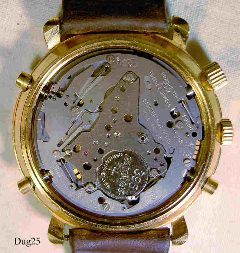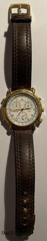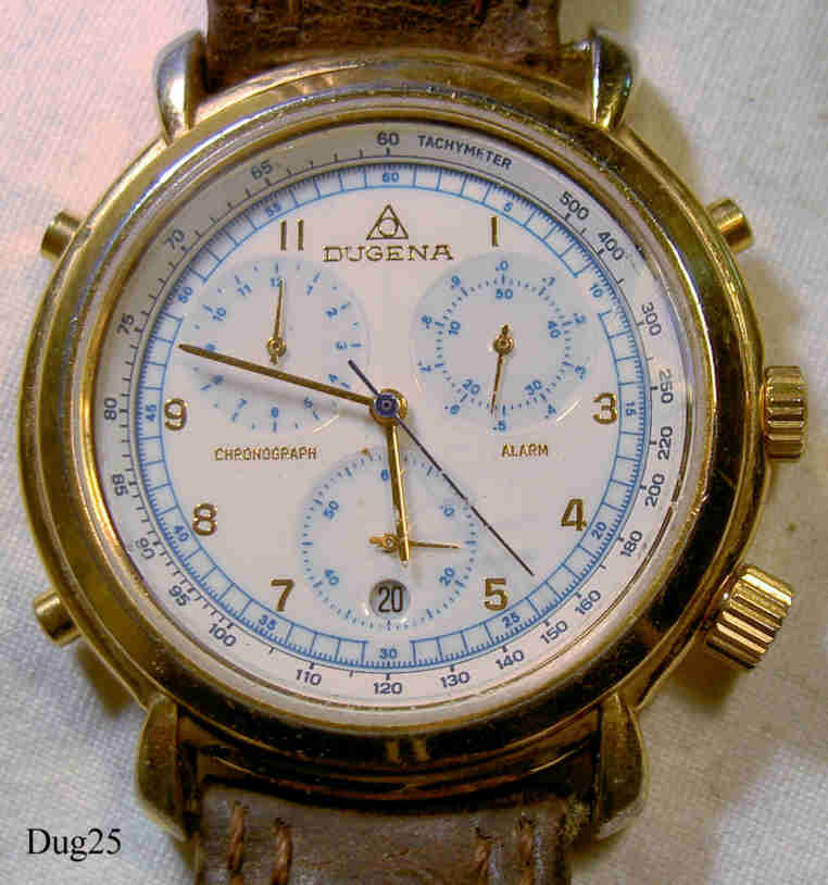 Ein Dugena Chronograph mit vergoldetem Gehäuse und Edelstahl Boden. Kaliber Miyota 3S10, Datum bei der 6, Beschriftung vorn: “Dugena, Chronograph, Alarm ”, hinten: ”Water Resistant, Edelstahlboden, 428772, 42, Cal 3S10”, innen: “Unadjusted, 3S10, twelve 12 Jewels, Miyota Co.”. Braunes Leder-Armband mit Dugena Schließe.