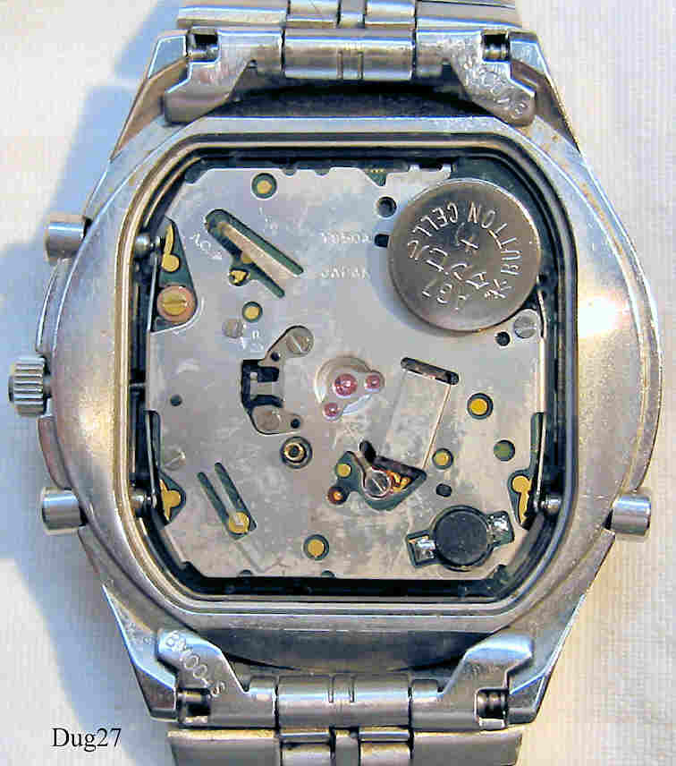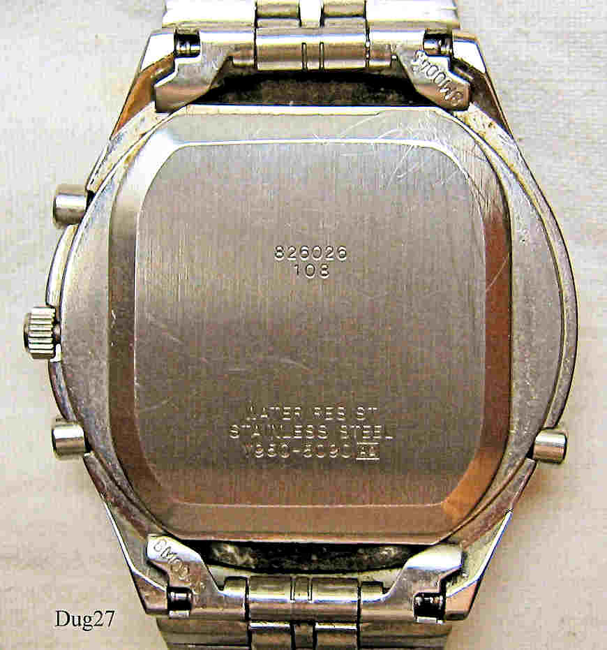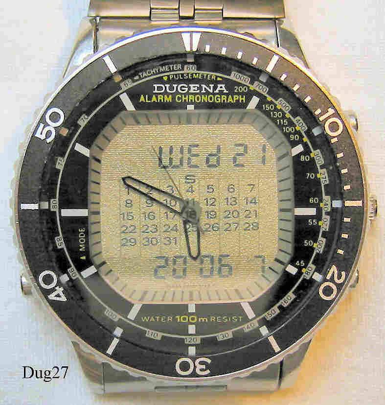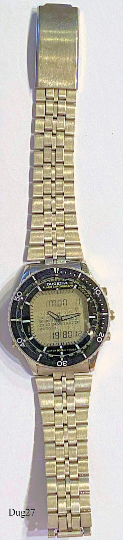 Ein Dugena Alarm Chronograph mit Edelstahl Gehäuse und Stainless Steel Back. Kaliber Epson (Seiko) Y950A, Beschriftung vorn: “Dugena, Alarm Chronograph, Water 100 M Resist”, hinten: ”826026, 108, Water Resist, Stainless Steel, W950-8090”, innen: “Y950A, Japan”. Alle Chronoanzeigen erfolgen auf einem LCD Display über dem Zifferblatt. Edelstahl Armband mit Dugena Schließe.