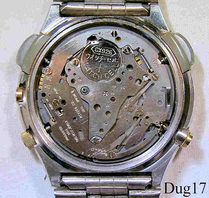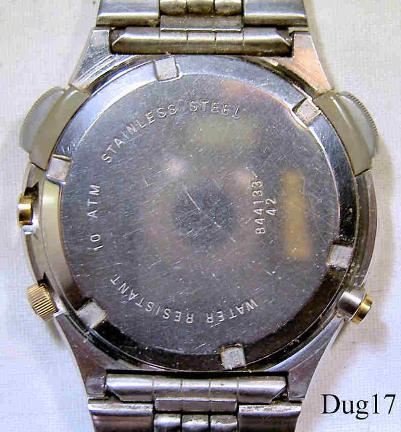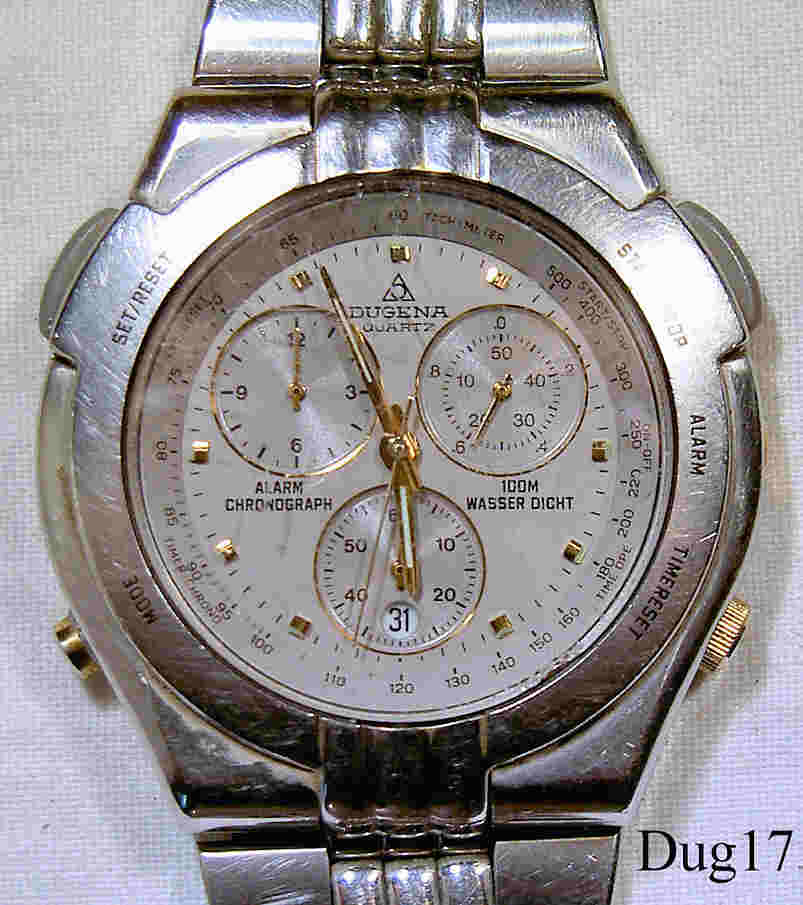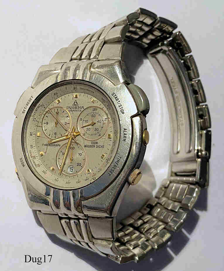 A Dugena Chronograph with Stainless Steel case and Back. Caliber Miyota 3S10, Date at 6, Signed front: “Dugena, Quartz, Alarm Chronograph, 100 M, Wasser Dicht”,  back: ”Water Resistant, 10 ATM, Stainless Steel, 844133, 42”, inside: “Unadjusted, 3S10, twelve 12 Jewels, Miyota Co.” Dugena stainless steel band with Dugena clasp.