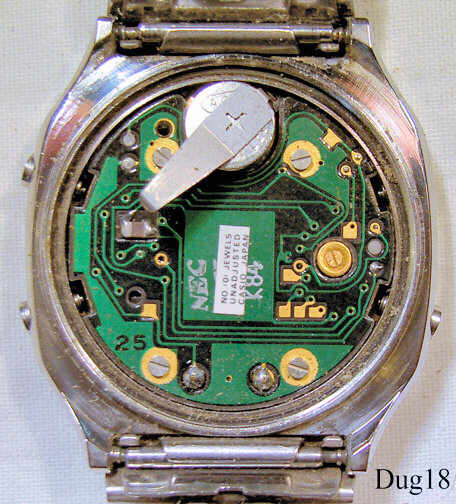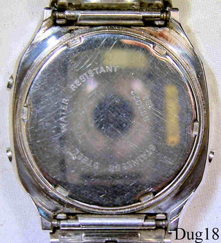 Ein Dugena LCD Alarm Chronograph mit Edelstahl Gehäuse und Stainless Steel Back. Beschriftung vorn: “Dugena, Alarm, Quartz” hinten: ”Water Resistant, Stainless Steel, 889022, 194”, innen: “NEC K84, No (0) Jewels, Unadjusted, Casio, Japan”, Alle Anzeigen erfolgen auf einem LCD Display, Uhrzeit und Wochentag gleichzeitig. Edelstahlarmband mit Dugena neutraler Schließe.