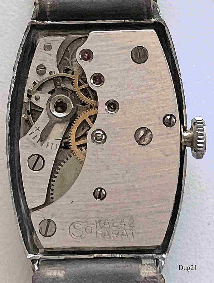 Eine Dugena Handaufzugsuhr mit Stahl Gehäuse und Edelstahl Boden. Kaliber Dugena 42, Beschriftung vorn: “Dugena, Bruchsicher”, hinten: ”DUGENA, Edelstahl-Boden”, innen: ”CSO, Parat, Kal 42”. Graues Lederarmband mit neutraler Schließe. Kaliber Osco 42.