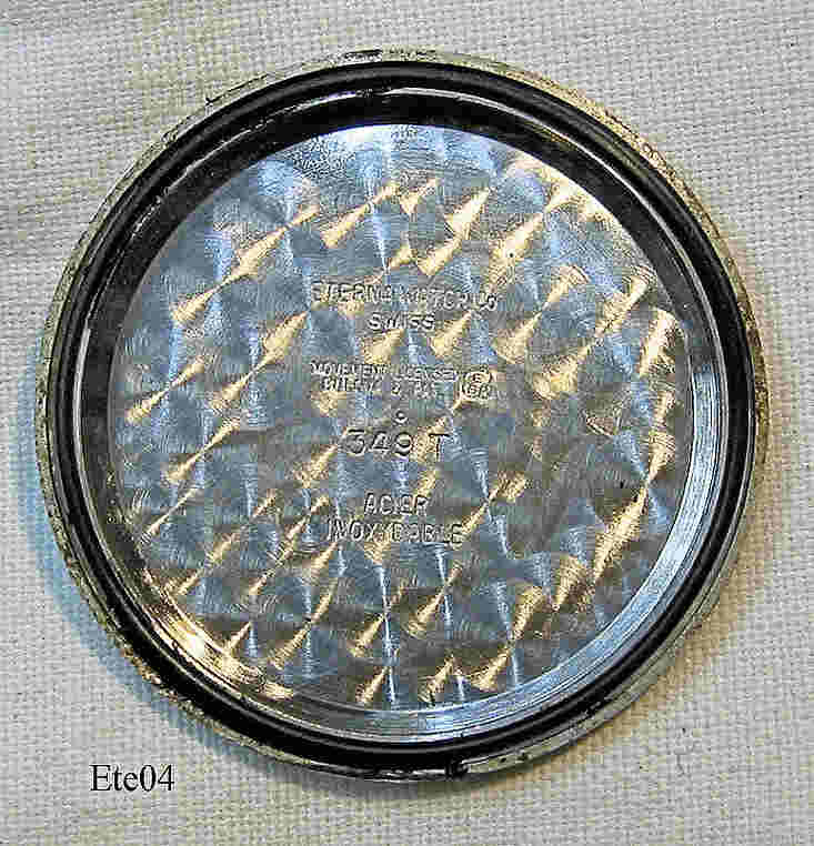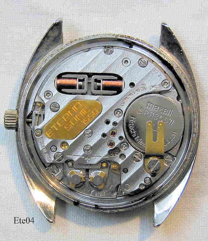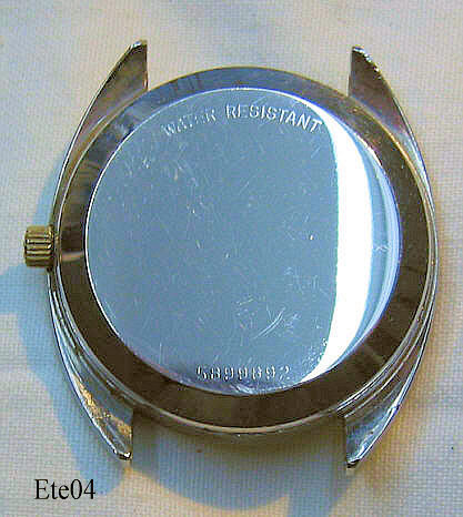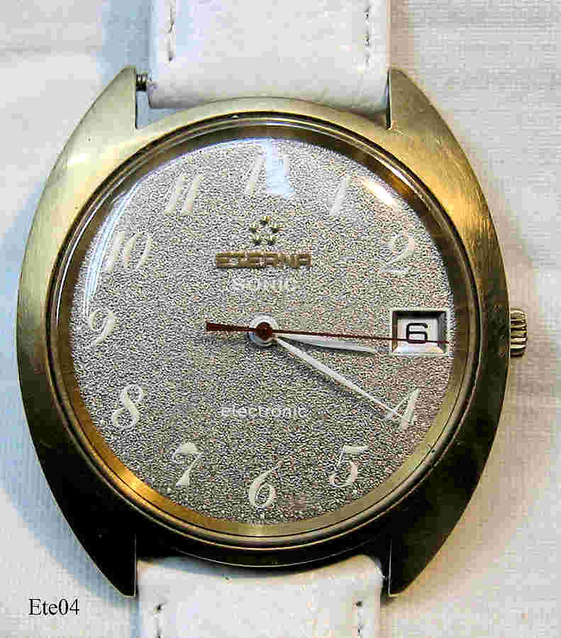 Dies ist eine Eterna Sonic mit vergoldetem Edelstahlgehäuse in einem sehr flachen Design. Das Werk ist ein Eterna 1550 (ETA 9162 ), beschriftet vorne: ”Eterna Sonic Electronic”, innen: ”ETERNA WATCH Co, 1550, Unadjusted, 12 Jewels”, hinten: ”Water Resistant, 5899892”, Deckel: ”Eterna Watch Co, Swiss, Movement licensed Bulova & Pat. ETA, 349T, Acier inoxydable” .