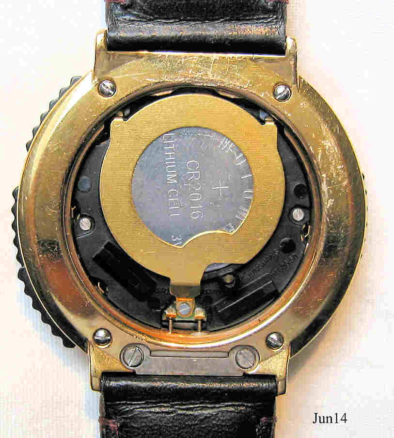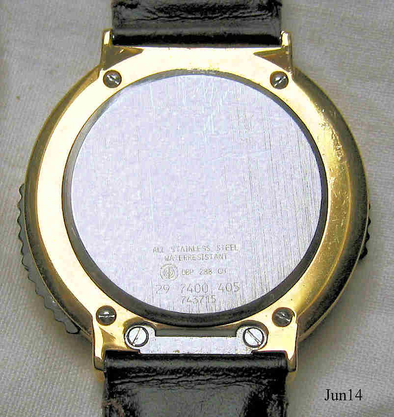 Eine Junghans Mega Alarm Chrono Funkuhr mit sehr eigenwillig aufgebautem Gehäuse. Messinggehäuse und Edelstahl Rückwand. Beschriftet: ”Junghans Mega”, hinten: “All Stainless Steel, Water Resistant, DBP 288 GH, 29 7400 405, 743745”, digitales Display bei der “12” mit Tag, Monat, Sekunden und Wochentags- Anzeige. Alternativ: Alarm1, Alarm2, Countdown, Stoppuhr