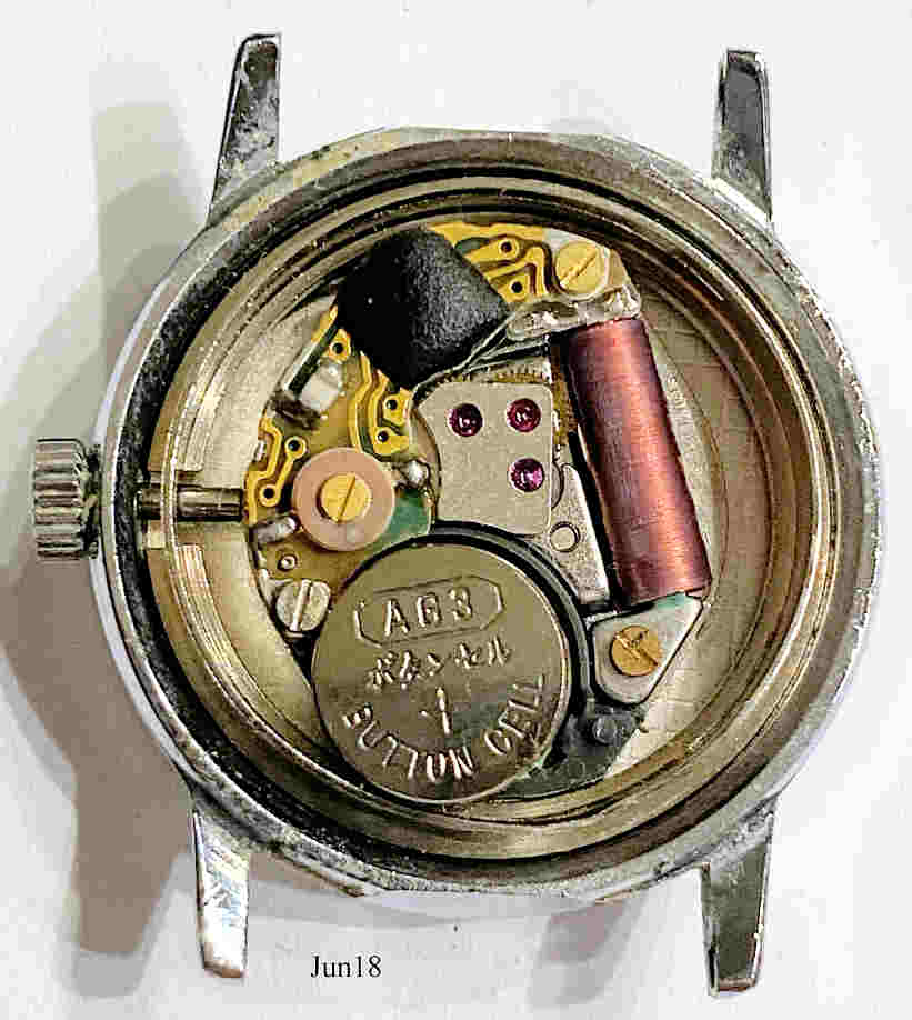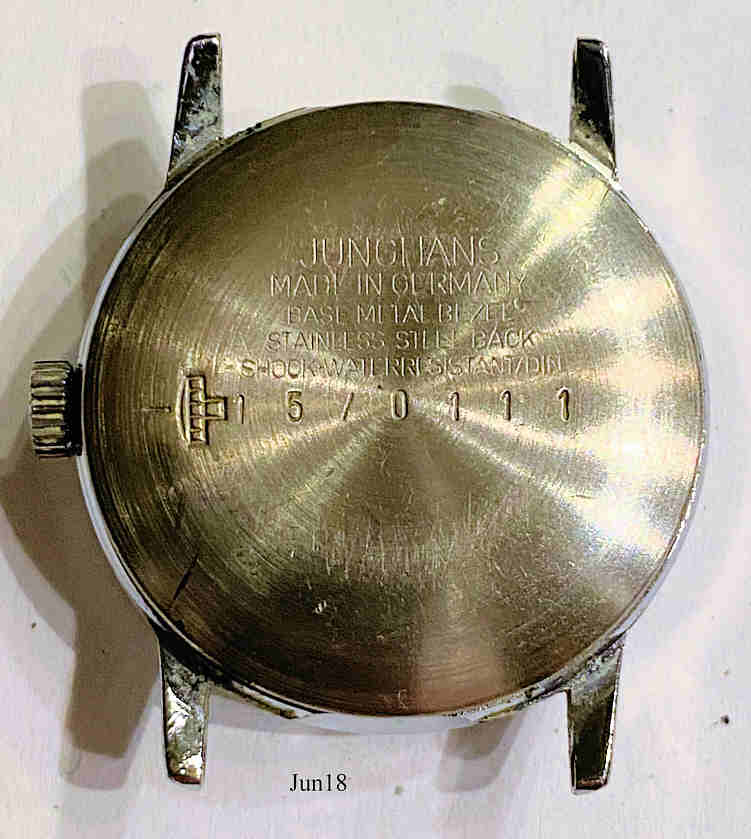 Eine Junghans Quartz Damenuhr im Edelstahl Gehäuse. Hier das Kaliber 40. Inschrift vorn: ”JUNGHANS, Quartz, Germany”, hinten: ”Junghans, Made in Germany, Base Metal Bezel, Stainless Steel Back, Shock and Water Resistant / DIN, 15 / 0111”, innen: ”EJ 40, West Germany, (5) Five Jewels, Unadjusted”.