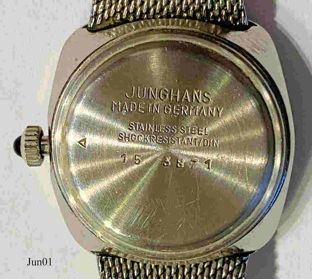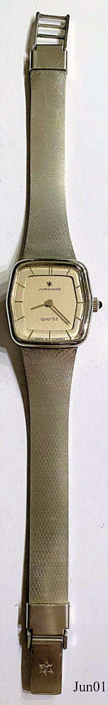 Eine Junghans Damen Schmuck Armbanduhr in Edelstahl. Inschrift vorn: “Junghans, Quartz”, hinten: ”JUNGHANS, Made in Germany, Stainless Steel , Shock Resistant/ DIN, 15-3871”, innen: “Five 5 Jewels, 632.51, Germany, Unadjusted”. Sehr geschmackvolles geschliffenes Milanaisearmband mit matt silberner Oberfläche. Siehe auch die passende Herrenuhr.