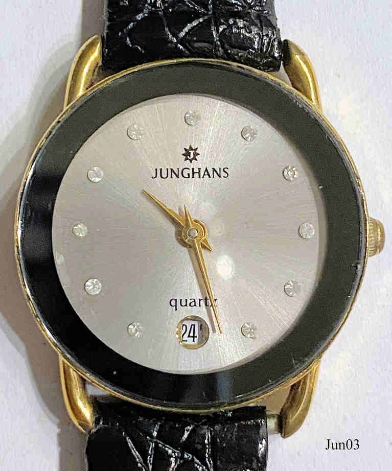 A Junghans ladies dresswatch with silver sunburst dial and attached zirkonia as numbers. Gold plated case and Stainless Steel Back. Signed front: ”Junghans, Quartz”, back: “Base Metal Bezel, Stainless Steel Back, Quartz, 47/7840”, inside: ”seven Jewels, Unadjusted, PUW 920-932, Germany, Seven 7 Jewels”, Movement PUW 920-932, see also the corresponding men’s watch.