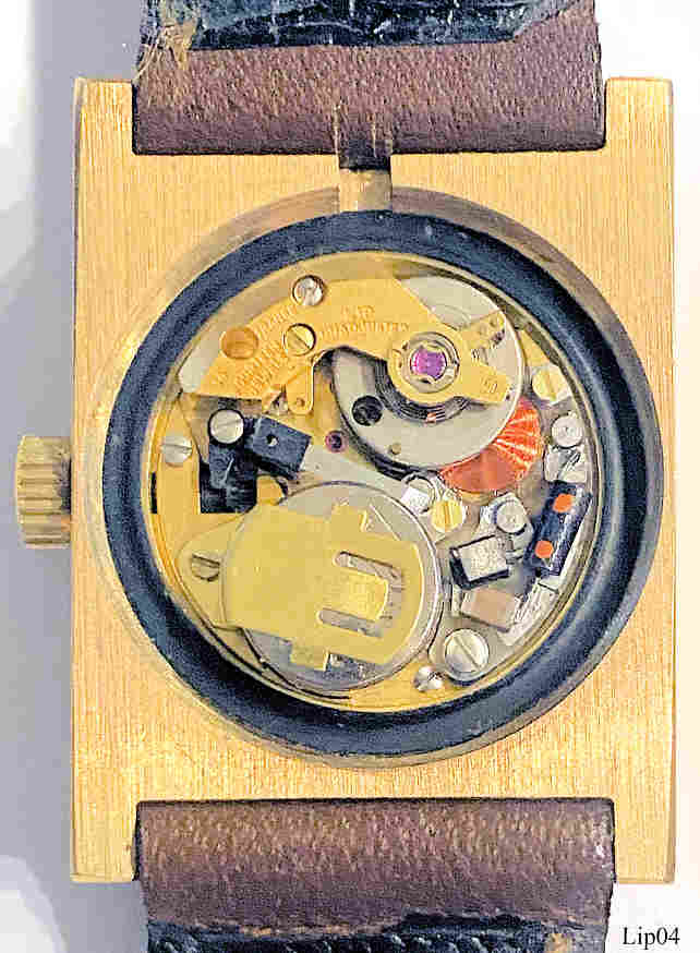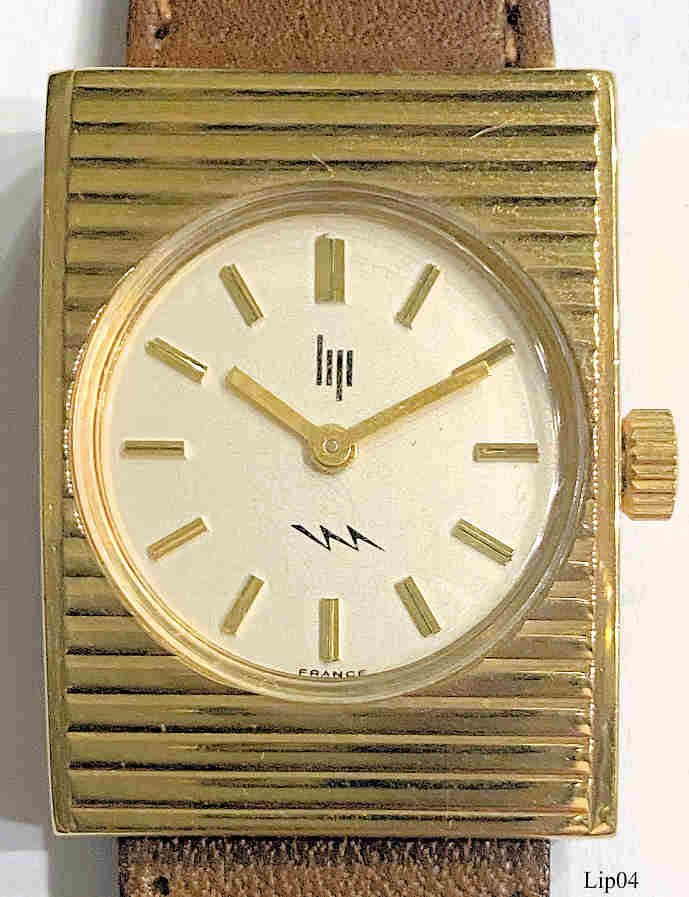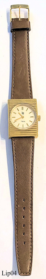 Eine LIP 16, eine der ersten elektrischen Armbanduhren. LIP hatte zwar 1952 als erster eine elektrische Armbanduhr angekündigt, wurde aber von Hamilton in der Markteinführung geschlagen und landete auf Platz zwei. Diese Uhr hat ein sehr schönes, vergoldetes Gehäuse und kann als Damen oder Herrenuhr getragen werden. Aufschrift vorn: “Lip, France”, hinten: “079893”, innen: ”14, Fourteen Jewels, Lip, Unadjusted, France, R50” Braunes, handgenähtes Lederarmband, Seriennummer 079893. Caliber Lip R50, ETA 9190.
