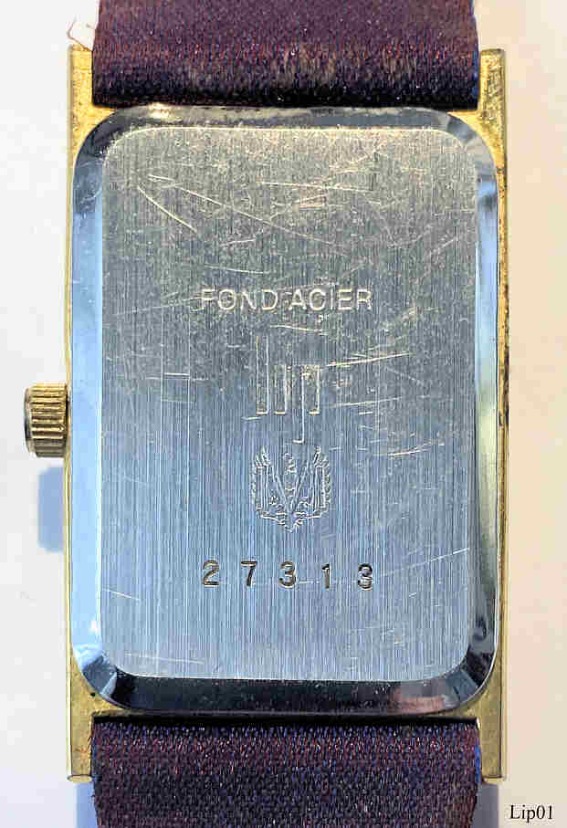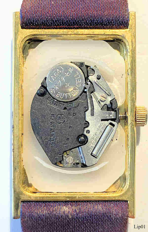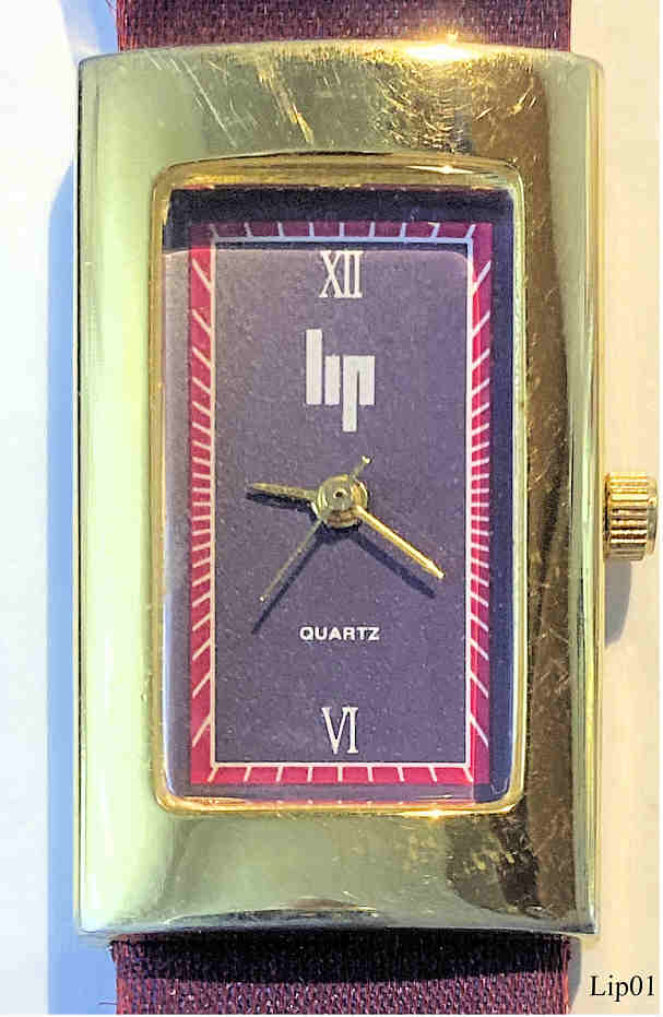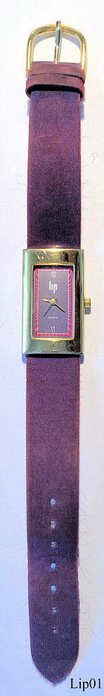 Eine sehr schöne Lip Damen Quartz Uhr mit violettem Zifferblatt. Inschrift: ”Lip, Quartz”, hinten: ”Font Acier, Lip, 27313”, innen: “ETA 802.105, Swiss Parts, Chinese Movement, No (0) Jewels”. Sehr auffälliges Lederarmband schimmernd zwischen weinrot und violett, durchzogen mit Goldfäden.