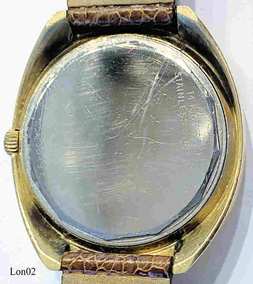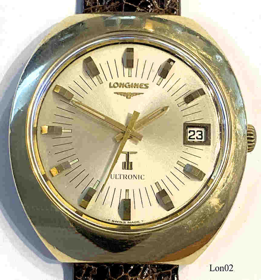 Dies ist eine Longines Ultronic, N° 15933497, Caliber 6312, ESA 9162, 14K Goldauflage, verschraubter Edelstahlboden. Beschriftet vorn: “Longines, Ultronic”, hinten: ”14 K GF Bezel, Stainless Steel Back, 15933497”, innen: “Longines, 6312, Unadjusted, 50580334, 12 Jewels”.