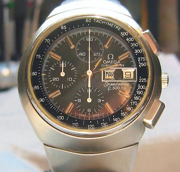 Ein Omega Speedsonic Chronograph, Werk Caliber 1255, Caliber ESA 9210, 12 Steine, Werknummer 38416176, Gehäuse Nr. 1880001, Edelstahlgehäuse mit dem “Languste” Band. ,Beschriftet: ”Omega, Chronometer,