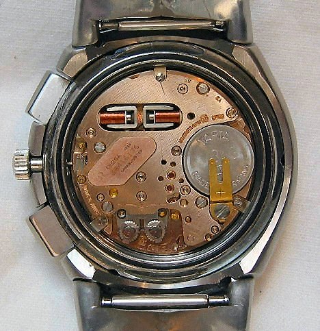 + 508925, 188.0001, 388.0800, Movement Licensed Bulova & Pat. ESA”. Datum und Kalender bei der 3, Tachymeterscheibe in schwarz, eckige Drücker. Eine sehr schöne Beschreibung der Uhr gibt es hier: http://www.zetleins.onau.net/reviews/SpeedsonicReview.htm