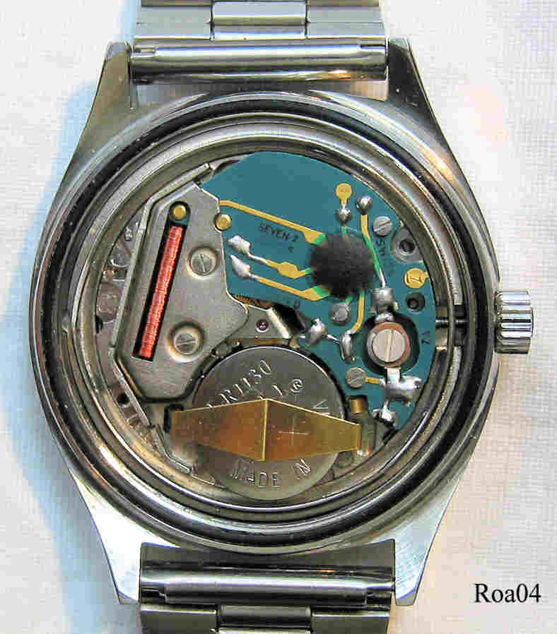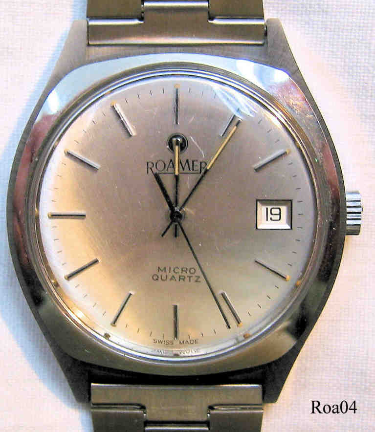 A Roamer Micro Quartz in Stainless Steel case with Stainless Steel band. Signed front: ”Roamer, Micro, Quartz”, back:”Stainless Steel, 349”, inside:” Swiss, seven”. Silver colored dial with white date at 3.