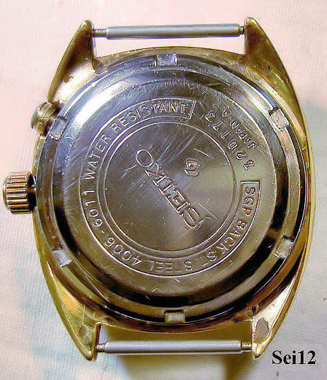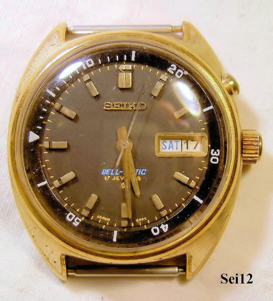 Dies ist eine Seiko Bellmatic Uhr mit vergoldetem Gehäuse und grauem Zifferblatt. Die Seiko Bellmatic wurde von 1966 bis 1978 gebaut. Es handelt sich hier um einen mechanischen Armbandwecker mit Automatic Werk. Beschriftung vorn:” Seiko, Bellmatic, 17 Jewels” hinten:”SGP Back St. Steel, 4006-6031, Water Resistant, Seiko, 680274, Japan A “, innen:”17 Jewels, 4006A”.