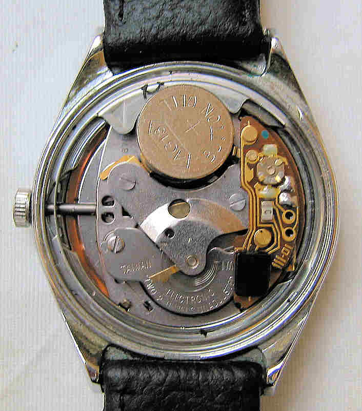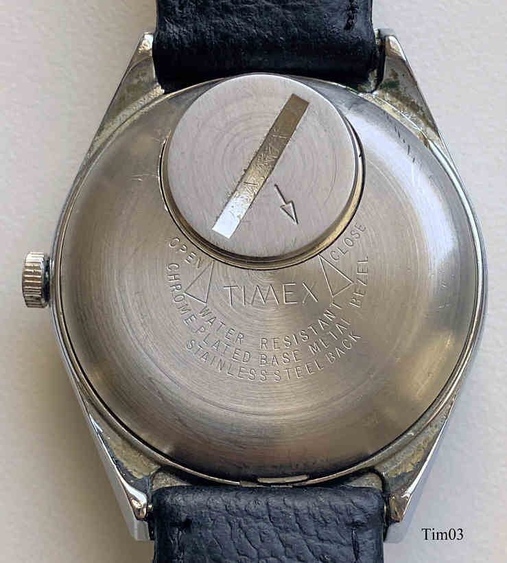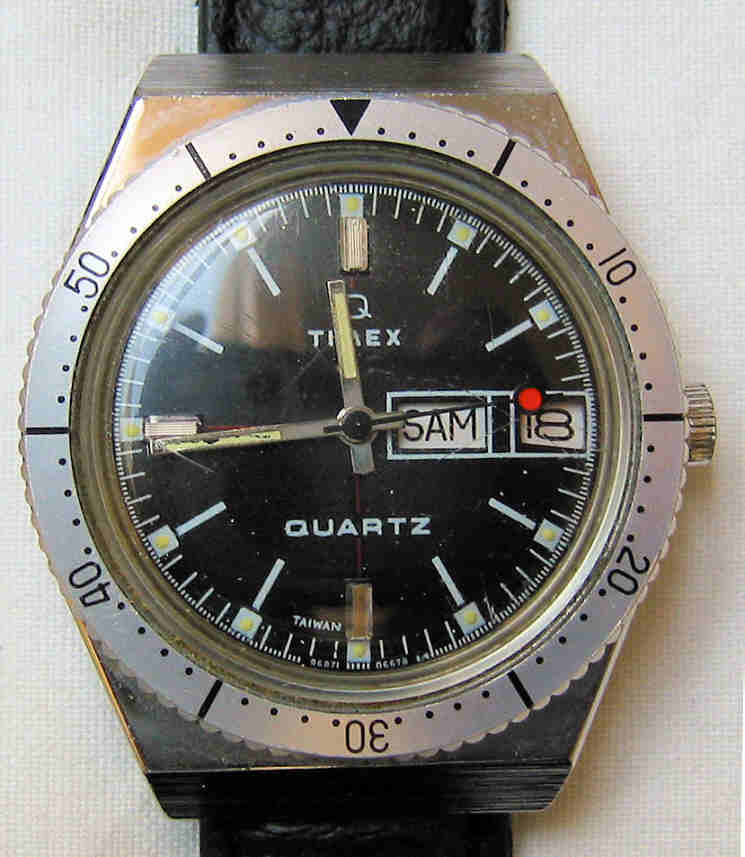 Dies ist eine Timex Quartz Taucheruhr mit Tag und Datum. Beschriftet: ”Q, Timex, Quartz, Taiwan”. Auf der Rückseite : Water Resistant, Chrome Plated Base Metal Bezel, Stainless Steel Back, Assembled in Taiwan”. Innen: ”Electronic, 2 Jewels Unadjusted”. Der Quartz stabilisiert die Unruhe, die konventionell die Zeiger antreibt.