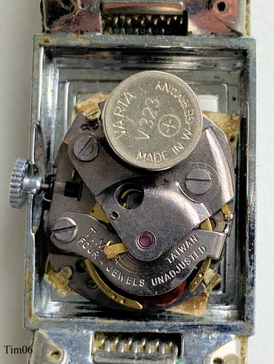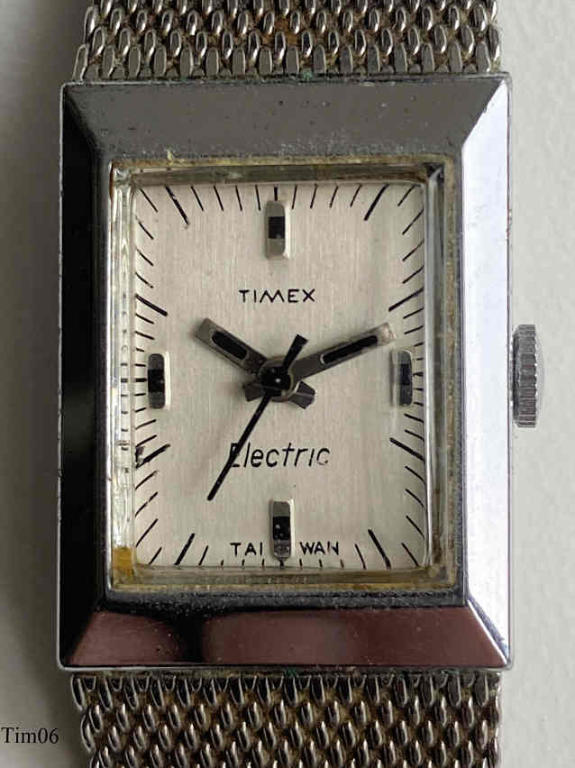 Dies ist eine Damen Timex electric, eine der ersten elektrischen Armbanduhren, bei denen die Batterie nur die Aufzugsfeder ersetzt. Die Unruhe wird über eine elektrisch angesteuerte Spule in ein Magnetfeld gezogen, über Kontakte wird der Stromkreis unterbrochen, die Unruhe schwingt zurück, der Stromkreis wird wieder geschlossen......Die Uhr hat ein schönes Gehäuse mit integriertem Milanaiseband. Bezeichnet vorn: “Timex, Eectric, Tai Wan”, hinten: “Base Metal Bezel, Stainless Steel Back”, innen: “Timex, Taiwan, Four 4 Jewels, Unadjusted, 168”.