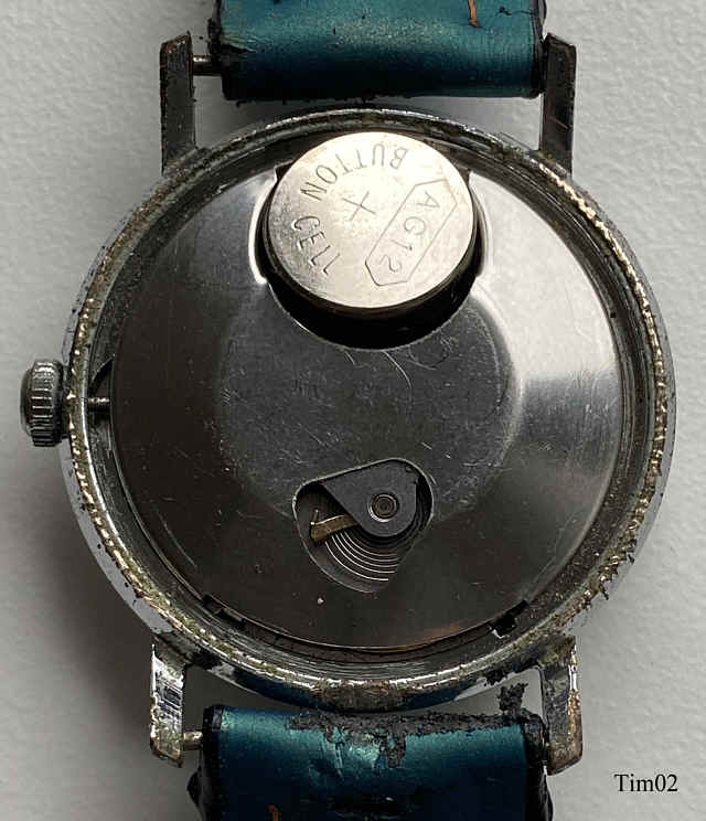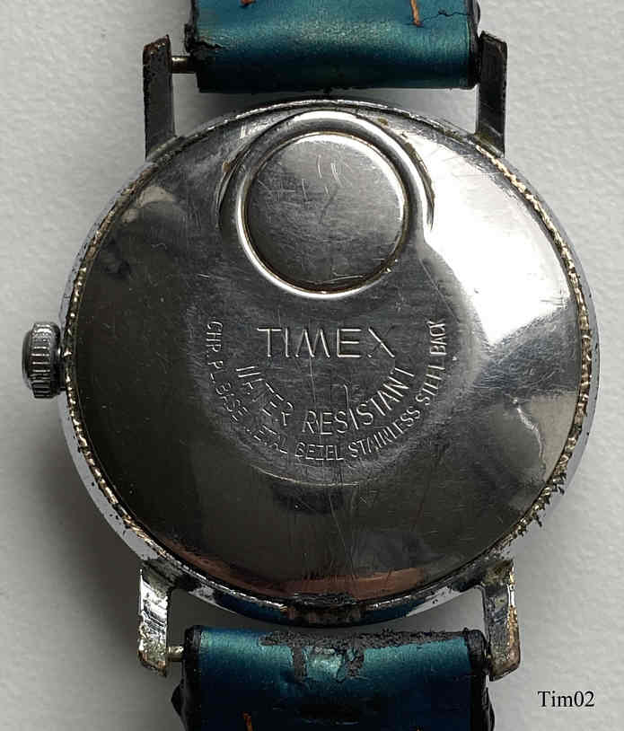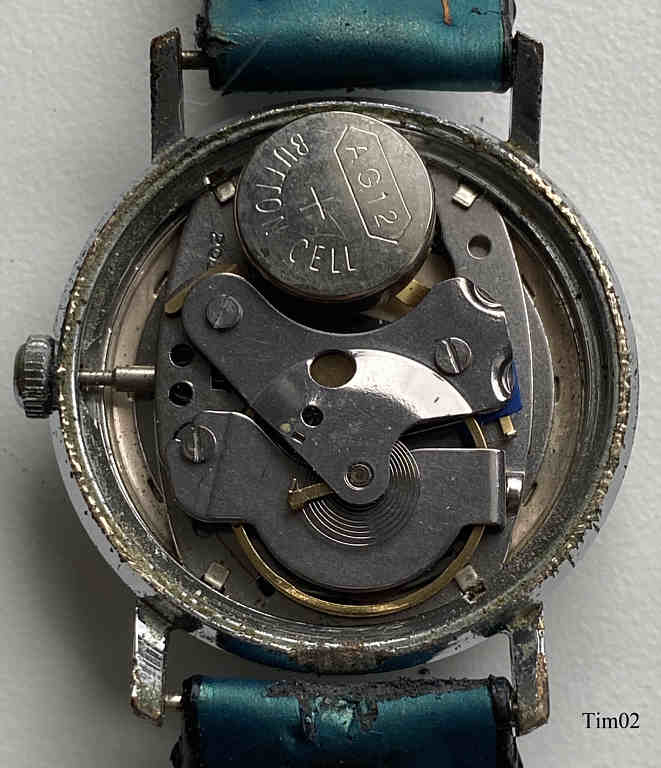Dies ist eine Timex electric, eine der frühen elektrischen Armbanduhren, bei denen die Batterie nur die Aufzugsfeder ersetzt. Die Unruhe wird über eine elektrisch angesteuerte Spule in ein Magnetfeld gezogen, über Kontakte wird der Stromkreis unterbrochen, die Unruhe schwingt zurück, der Stromkreis wird wieder geschlossen......Die Uhr hat ein sehr einfaches Gehäuse, wie bei Timex üblich.Beschriftet vorn: “Timex, Electric, 9417, 4070”, hinten: “Timex, Water Resistant, Chr. Pl. Base Metal Bezel, Stainless Steel Back”, innen: “201”. Timex Kaliber M40