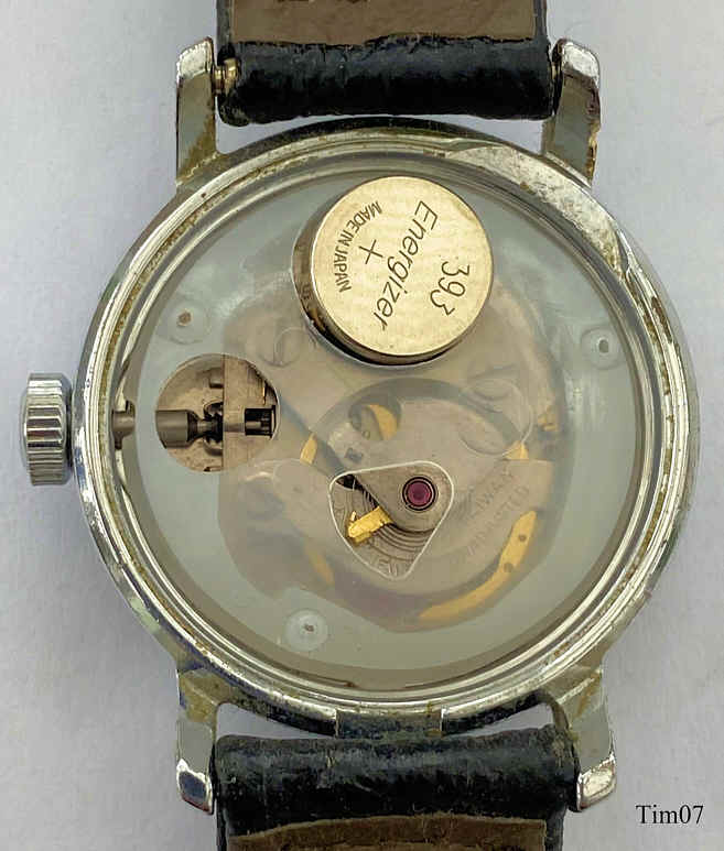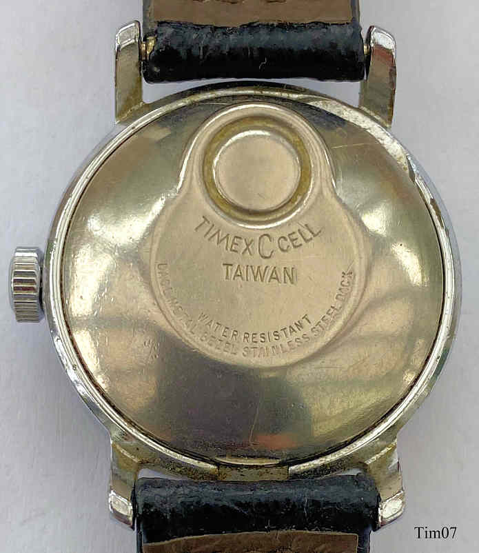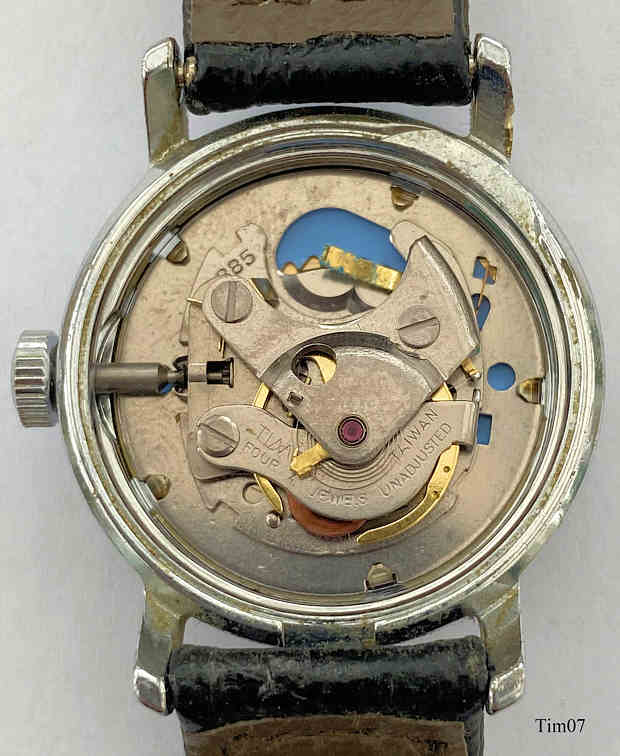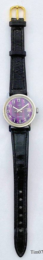 Dies ist eine Damen Timex electric, eine der frühen elektrischen Armbanduhren, bei denen die Batterie nur die Aufzugsfeder ersetzt. Die Unruhe wird über eine elektrisch angesteuerte Spule in ein Magnetfeld gezogen, über Kontakte wird der Stromkreis unterbrochen, die Unruhe schwingt zurück, der Stromkreis wird wieder geschlossen......Die Uhr hat ein sehr einfaches Gehäuse, wie bei Timex üblich. Bezeichnet vorn: “Timex, Electric, Dial England”, hinten: “Timex C Cell, Taiwan, Water Resistant, Base Metal Bezel, Stainless Steelback”, innen: “Timex, Taiwan,Four 4 Jewels, Unadjusted, 385”. Schwarzes Lederband.