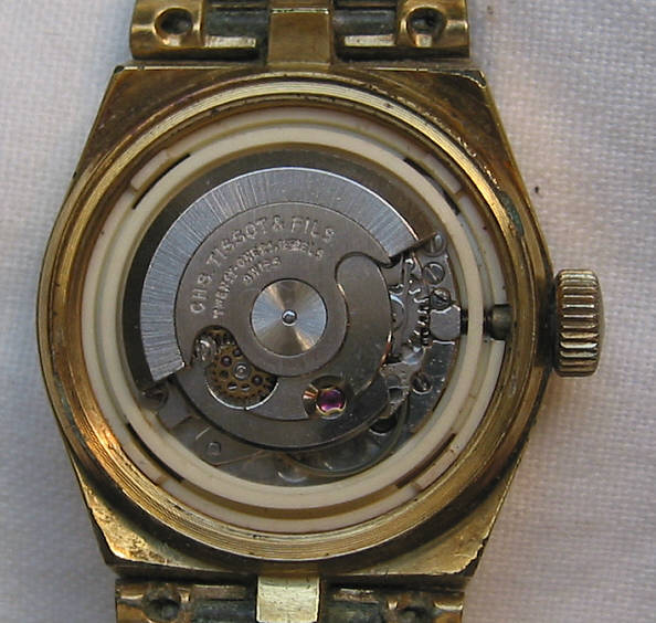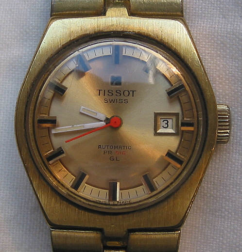 Eine Tissot Automatic Damenuhr PR516GL. Werk Caliber W151, Werknummer 100926, Gehäuse Base Metal, vergoldet, Edelstahl Schraubboden. Beschriftet vorn:”Tissot, Swiss, Automatic, PR 516 GL, Swiss Made”, innen:”