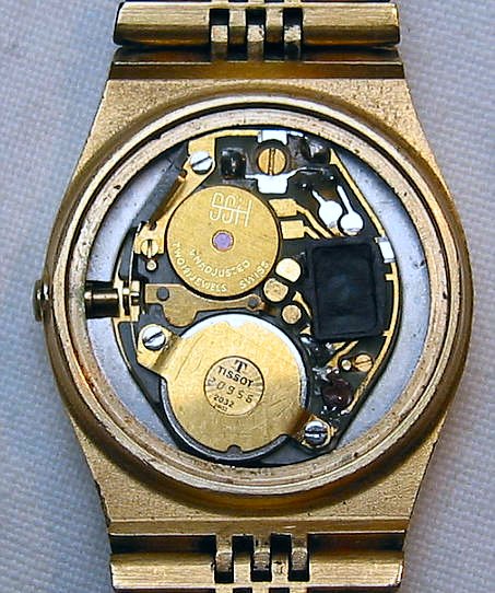 Gehäuse vergoldet. Beschriftet vorn:”Tissot, Stylist, Quartz”, innen:”Tissot, 20956, 2032, SSH, unadjusted, two (2) Jewels, Swiss” keine Beschriftung auf der Rückseite. Diese Uhr hat keine Krone, gestellt wird über einen Druckknopf und den Steppermotor.