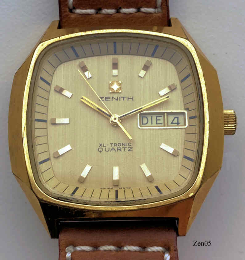 Eine Zenith Quartz Uhr mit Certina 29-262 Werk, Aufschrift vorn:”Zenith, XL-Tronic, Quartz”, innen:” Certina, 29-262, seven 7 Jewels, Swiss”, hinten:” Surf Stainless Steel Back, Gold Electroplated Bezel, 20-0020-515”. Braunes handgenähtes Lederarmband