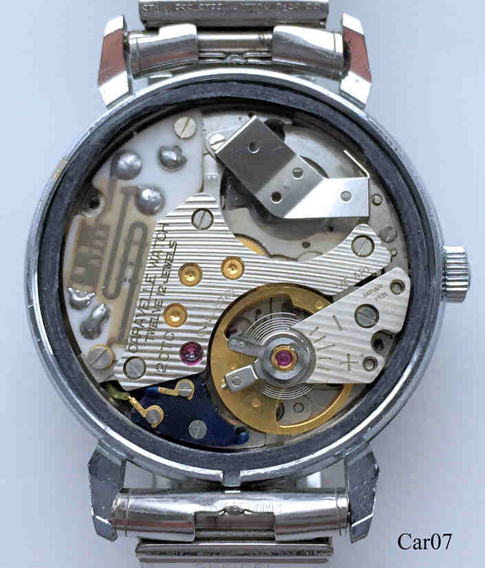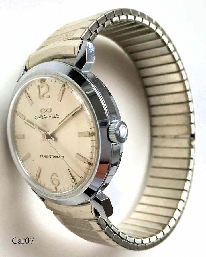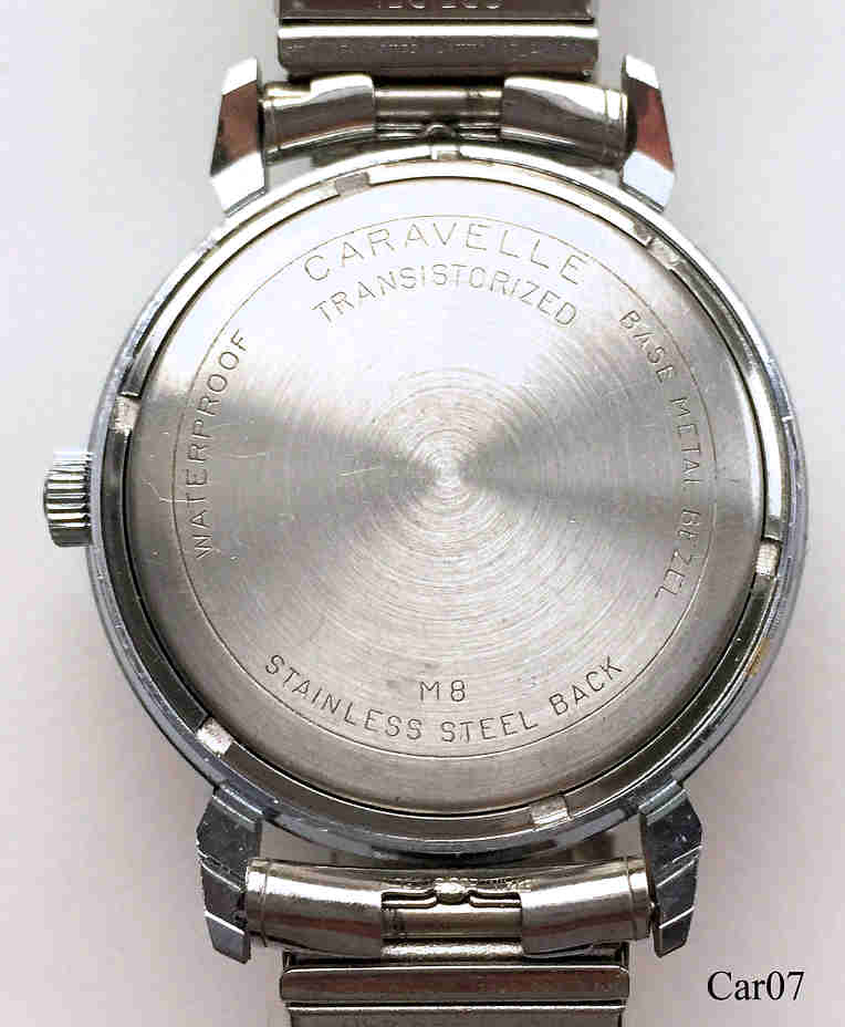Dies ist eine Bulova Caravelle Transistorized Electronic Uhr, Beschriftet vorn: ”Caravelle, Transistorized” innen: ”Caravelle Watch, twelve 12 Jewels, 12OTC, unadjusted, LIC ATO, M8”€¯, hinten: ”€¯Caravelle, Transistorized, Base Metal Bezel, Stainless Steel Back, Water Proof, M8”. Citizen X8 4830 Werk, Speidel Flex Band
