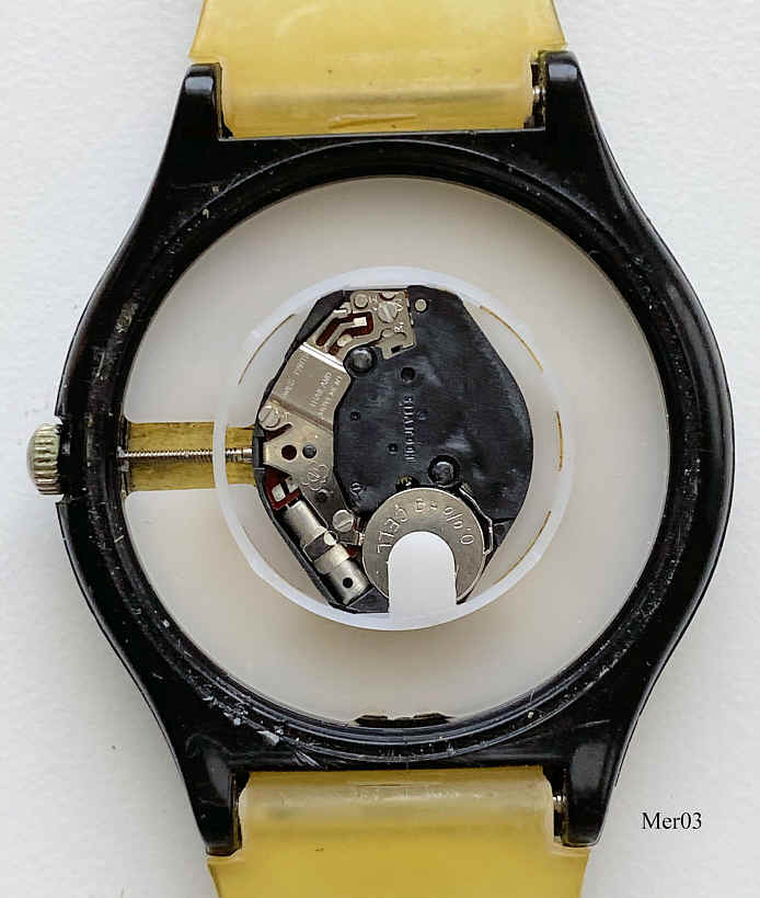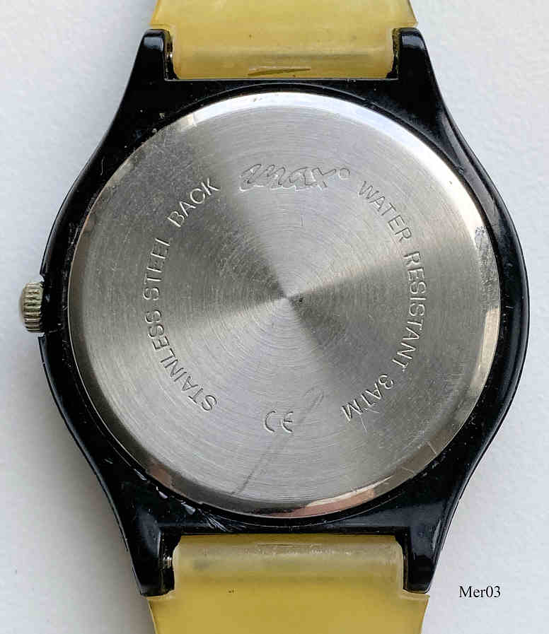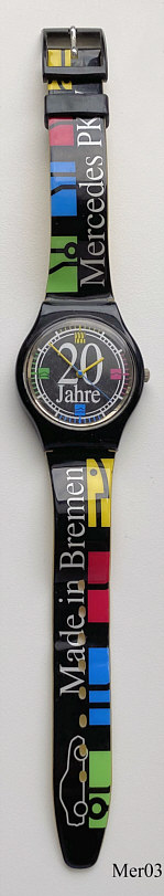 Eine Quartzuhr im Swatch Design zur Erinnerung an 20 Jahre Mercedes Werk Bremen 1998. Beschriftet vorn: “20 Jahre”, hinten: ”Stainless Steel back, max, Water Resistant, 3 ATM”, innen: “ No 0 Jewels,Swiss Parts, Thailand Movement, ETA 802.104”. Das Werk ist ein ETA Kaliber 802.104.Auf dem Armband: “Made in Bremen, Mercedes PKW”