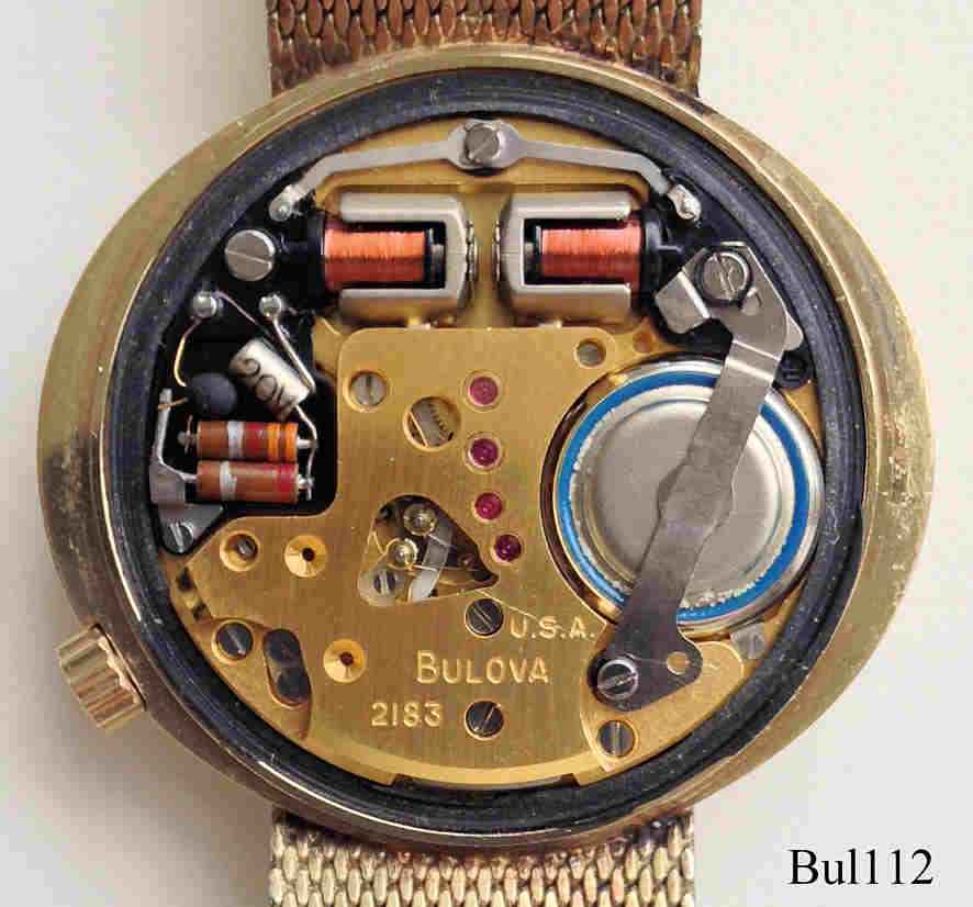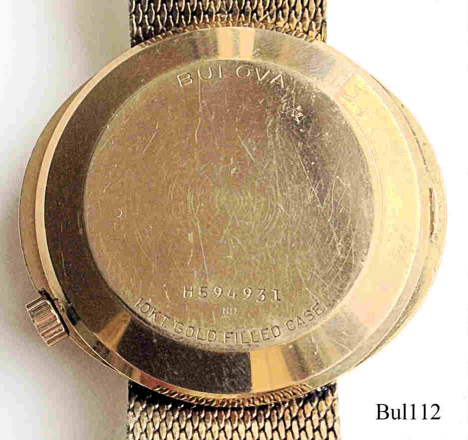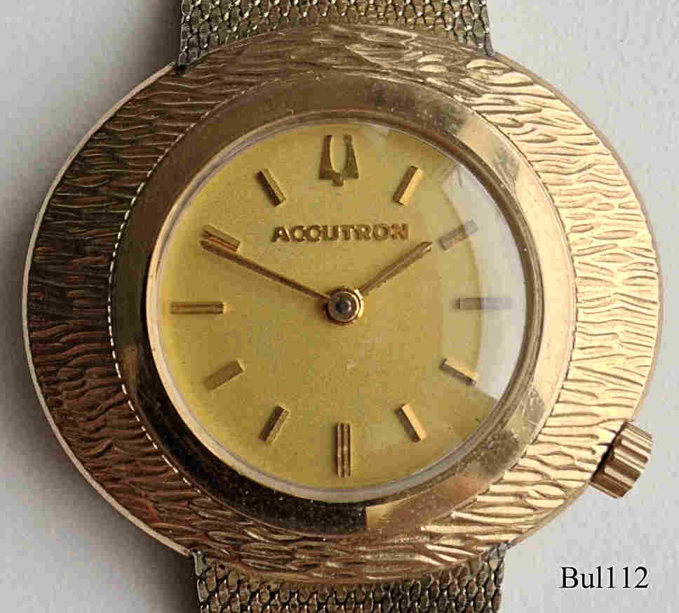 Eine Bulova Accutron mit ovalem 10 K vergoldetem Gehäuse ohne Zentralsekunde, goldenes Zifferblatt, Beschriftet vorn: ”Accutron”, hinten: “BULOVA, H594931, N0”, innen: “U.S.A. Bulova, 2183”. Case # B3022, Kaliber 2183, Herstelldatum 1970 (N0), Krone bei 4, integriertes 10K vergoldetes Champion Gliederarmband.