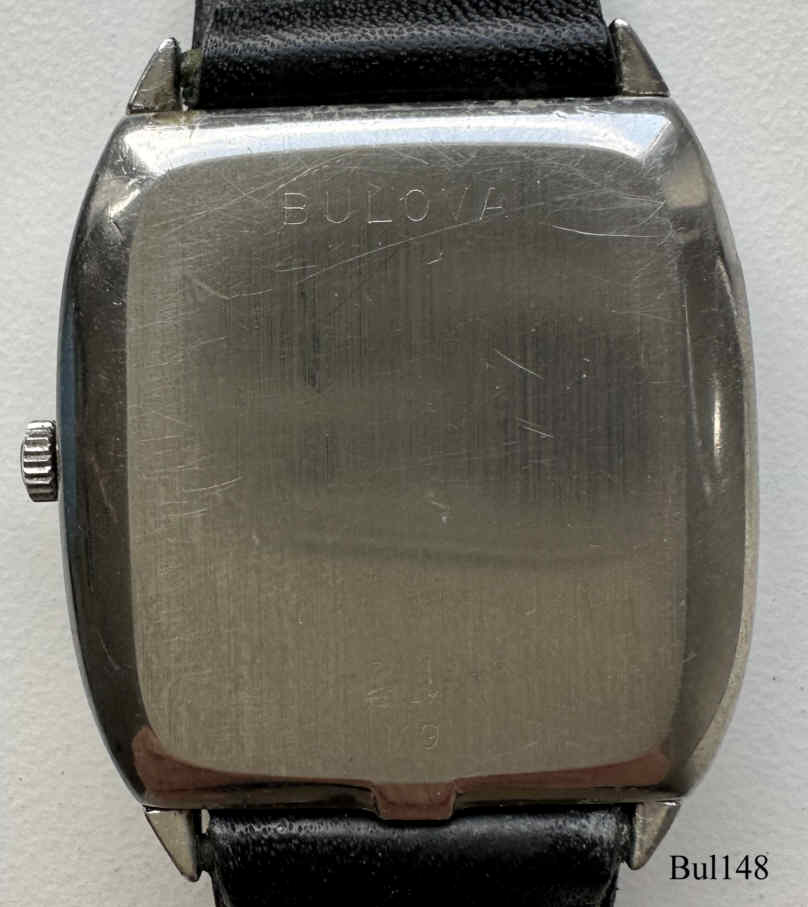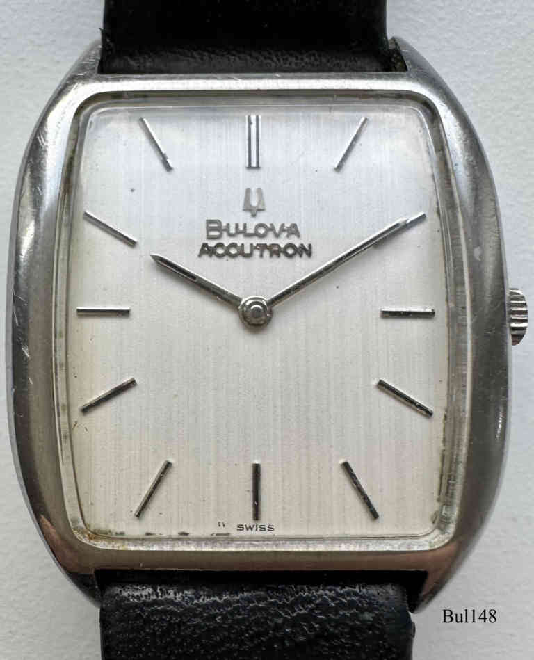 Bulova Accutron with rectangular stainless Steel case without sweep second hand, white dial. Signed front: “Bulova, Accutron”, back: ”BULOVA, 1-794948, M9”, inside: “USA, BULOVA, 2183”, Case # 769-1, Caliber 2183, crown at 3, white dial, manufacturing date 1969 (M9), black leather band.
