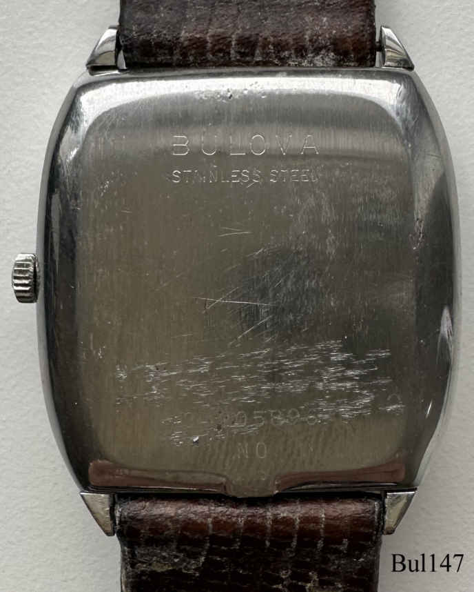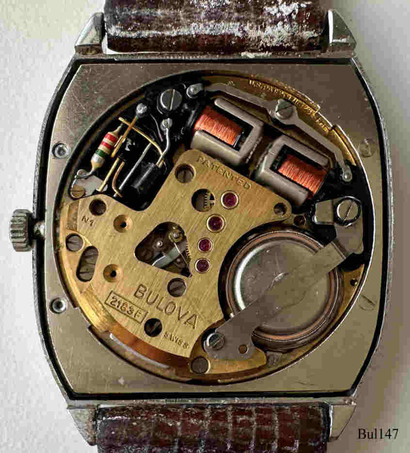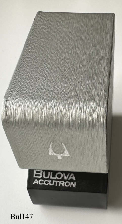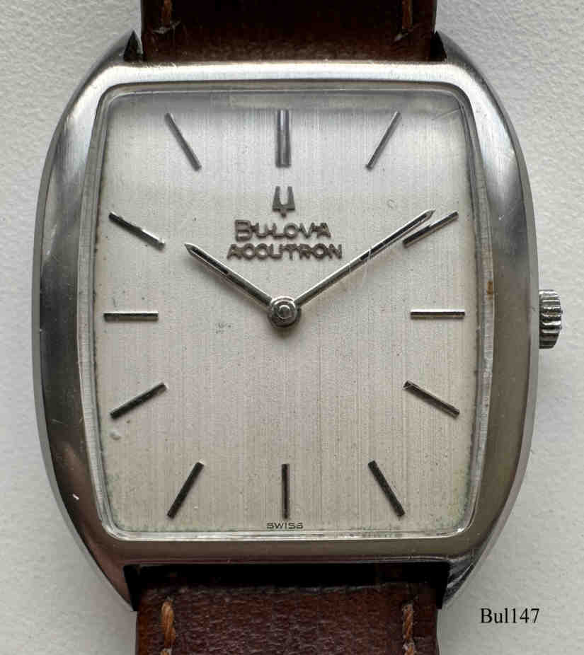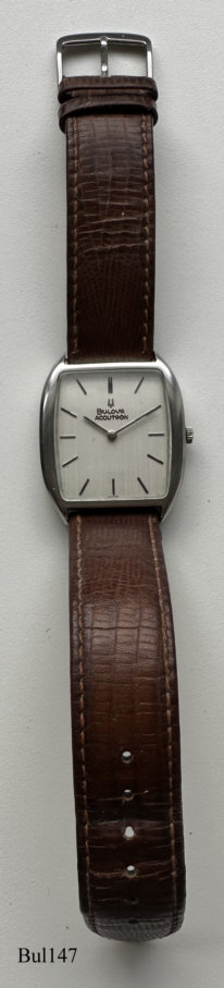 Eine Bulova Accutron mit ovalem 10 K vergoldetem Gehäuse ohne Zentralsekunde, goldenes Zifferblatt, Beschriftet vorn: ”Accutron”, hinten: “BULOVA, H594931, N0”, innen: “U.S.A. Bulova, 2183”. Case # B3022, Kaliber 2183, Herstelldatum 1970 (N0), Krone bei 4, integriertes 10K vergoldetes Champion Gliederarmband.