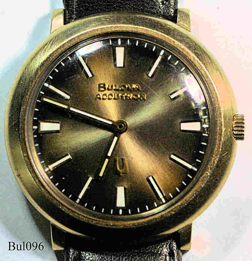 Eine Bulova Accutron mit vergoldetem Gehäuse, Beschriftet vorn: ”Bulova, Accutron”€¯, hinten: ”I858157, Bulova, Gold Electroplate Bezel, Water resistant, Stainless Steel back, N5”€¯, innen: ”Bulova, USA, 2210, N5”, Caliber: 2210, Herstelldatum 1975 (N5), Case # 3440, verschraubter Boden, braunes Lederarmband.