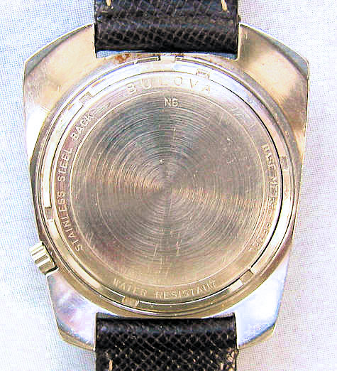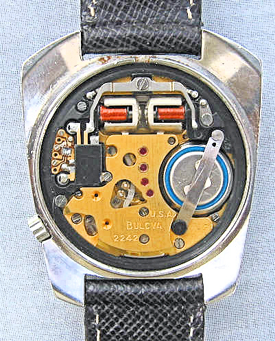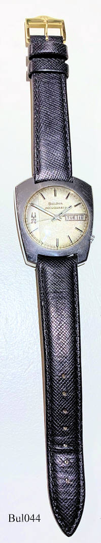 Bulova Accuquartz watch with base metal case, signed front: “Bulova, Accuquartz”, back: “Bulova, Base Metal Bezel, Water Resistant, Stainless Steel Back, N6, F477138”, inside: “USA, Bulova, 2242”, .Case # G3628, Caliber 2242, date of munafacture 1976 (N6), Day/Date at 3, crown at 4. This is the last tuning fork caliber, where the tuning for is only used as driver for the hands, the accuracy is achieved by using a quartz timing circuit. Visible mark of Accuquartz is the zirkonia at 9.