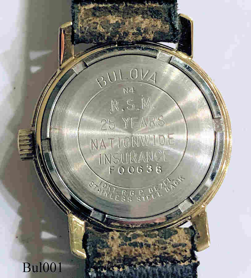 Eine Bulova Accutron Damenuhr mit matt vergoldetem Gehäuse, Beschriftet vorn: “Bulova, Accutron”, hinten: ”Bulova, Patented, Stainless Steel, Water Resistant, N4, F00638, Gravur: R.S.M., 25 Years, Nationwide, Insurance”, innen: ”Patent, BulovaWatch Co., Swiss 13 Thirteen Jewels, Unadjusted, N4, 2301” Caliber 2301, Herstelldatum 1974 (N4), braunes Samtarmband.