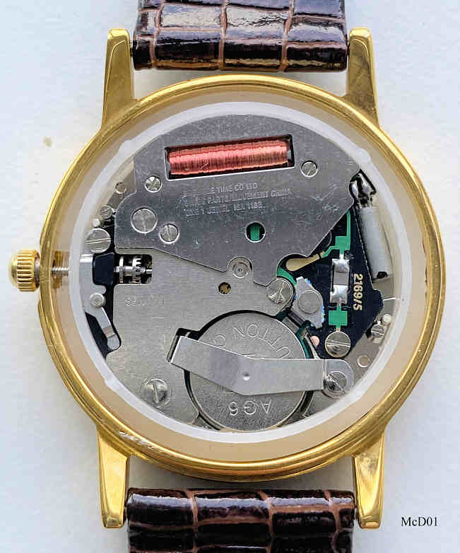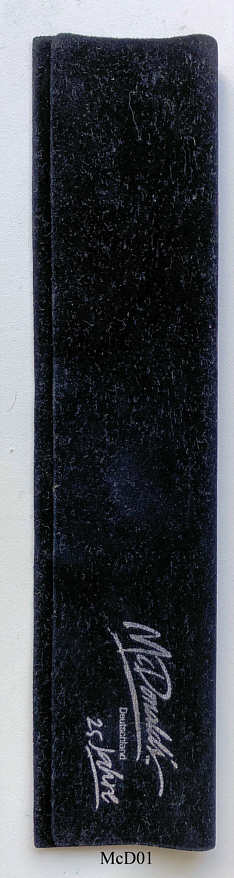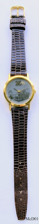 Eine Werbeuhr zum 25 jährigen Jubiläum von McDonalds in Deutschland. Die Uhr ist sehr interessant gemacht, eine polarisierte Acrylscheibe bildet den Sekundenzeiger und in Verbindung mit dem polarisierten Glas der Uhr ist das Zifferblatt nur bei 12 und 6 deutlich zu sehen, bei 3 und 9 ist es schwarz. Beschriftet innen: “ Prestige Time Co., Swiss Parts, Movement China, One 1 Jewel, ISA 1198”, hinten: ”Mc Donalds 25 Jahre in Deutschland, Danke, 1971 - 1996”