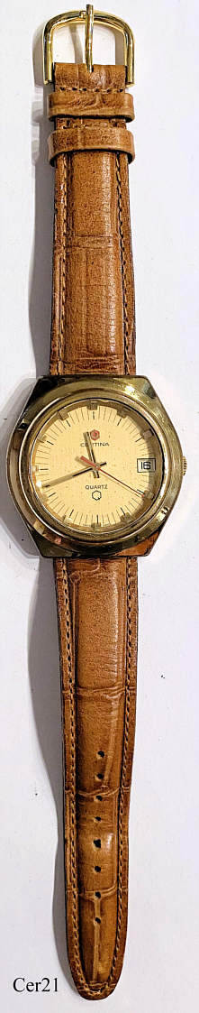 An early Certina Quartz watch, signed front: ”Certina, Quartz, Swiss Made”, inside: ”Seven 7 Jewels, Swiss, Y2”, back: ”9106 003, 9405397”. brass case, screw down back, Caliber ESA 9181.