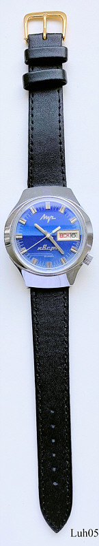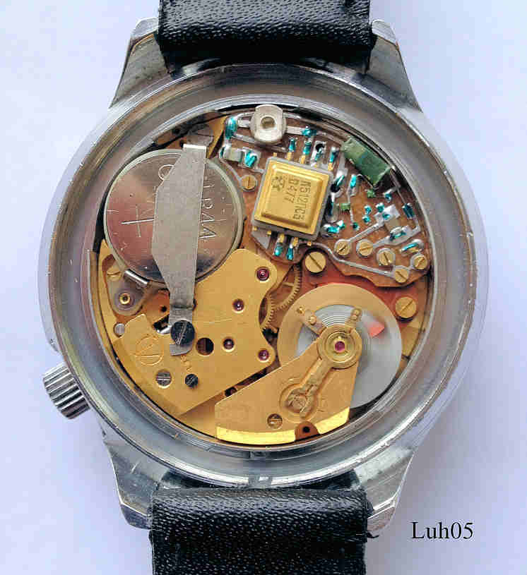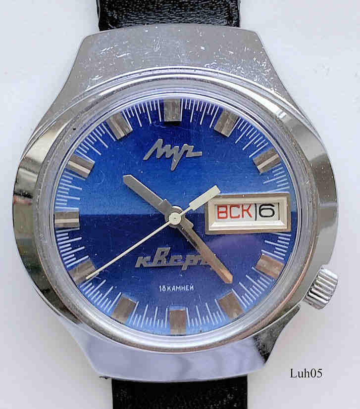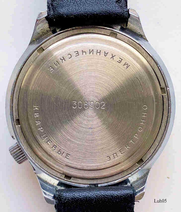 Eine Luch Hybrid Quartz Uhr der Minsker Uhren-Manufaktur in Belarus. Kaliber 3055. Dies ist nach der 3045 das zweite Russische Quartzuhrwerk. Edelstahl Gehäuse mit Krone bei der 4. Beschriftung vorn russisch: ”LUCH, Quartz”, innen: ”Logo, SU 3055”, hinten: “ 308902”.