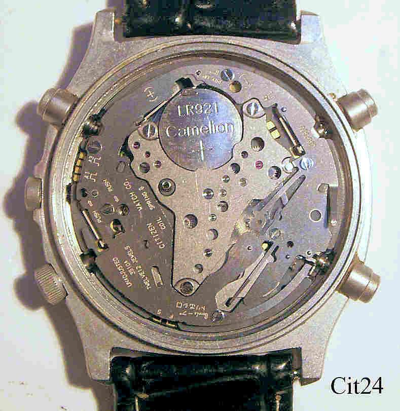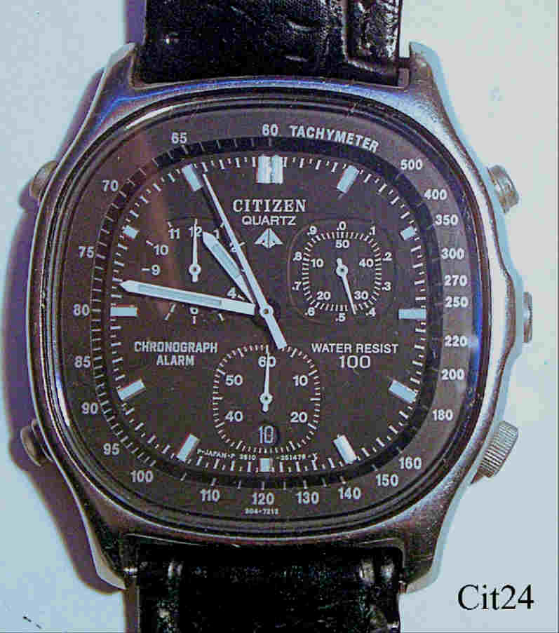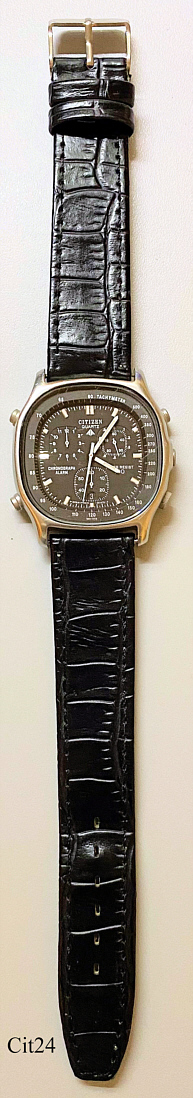 Ein Citizen Chronograph mit Edelstahl Gehäuse und Stainless Steel Back. Kaliber Citizen 3510 (Miyota 3S10), Datum bei der 6, Beschriftung vorn: “Citizen, Quartz, Chronograph, Alarm, Water Resist, 100“, hinten: “Citizen, Water Resist, Stainless, 3510-351240 K, 50600395, 37-30367, GN-4-S, Japan”, innen: “Unadjusted, 3510, Twelve 12 Jewels, Citizen Watch Co.”. Schwarzes Lederarmband.