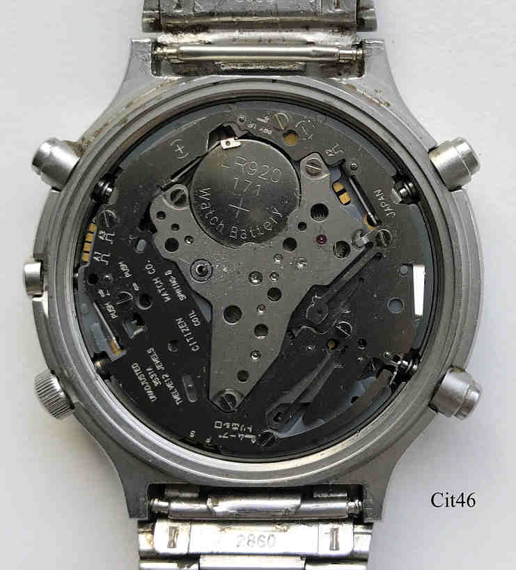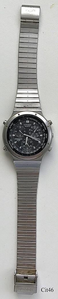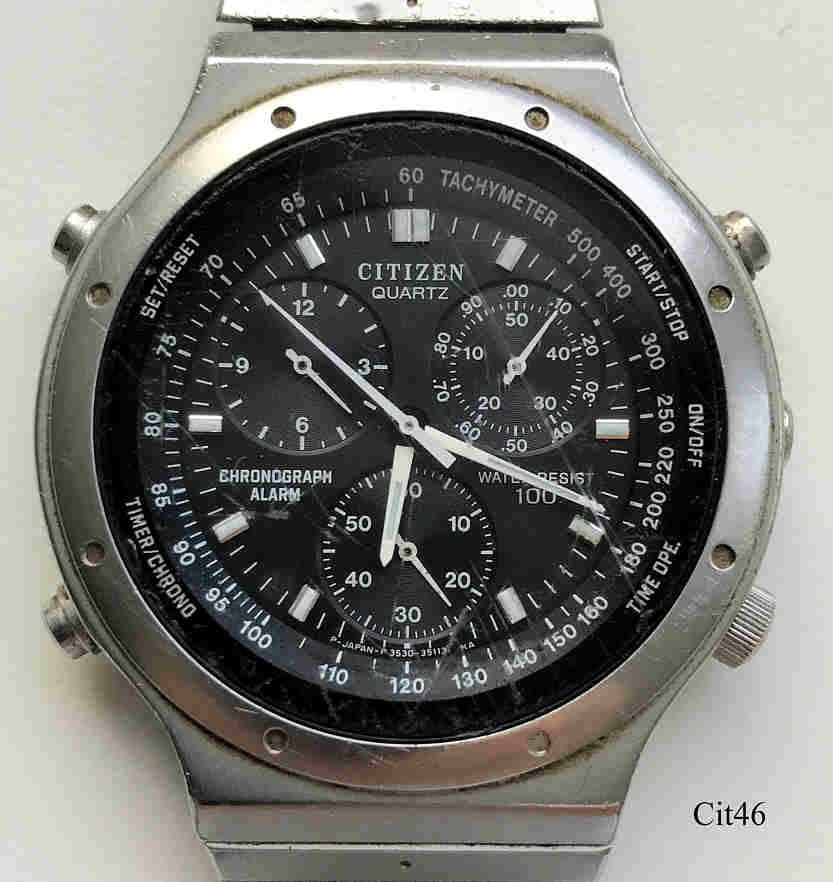 Ein Citizen Chronograph mit Edelstahl Gehäuse und Stainless Steel Back. Kaliber Citizen 3530 (Miyota 3S30), Beschriftung vorn: “Citizen, Quartz, Chronograph, Alarm, Water Resist, 100“, hinten: “Citizen, Water Resist, Stainless, 3530-351081TA, 508238, 37-1092, GN-4-S, Japan”, innen: “Citizen Watch Co., unadjusted, 3S31A, twelve12Jewels, Japan”. Edelstahl Gliederarmband.