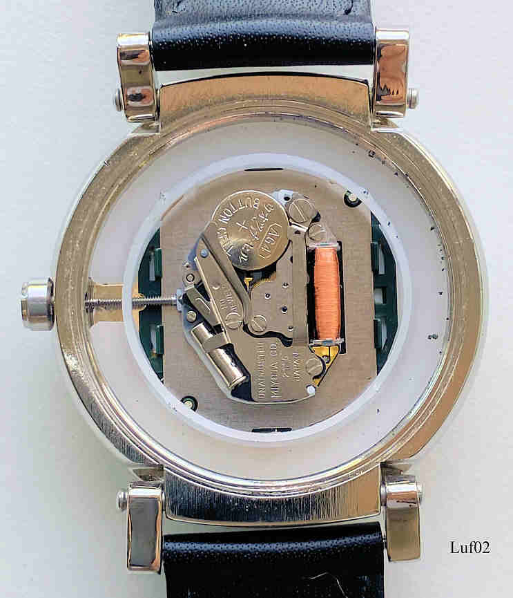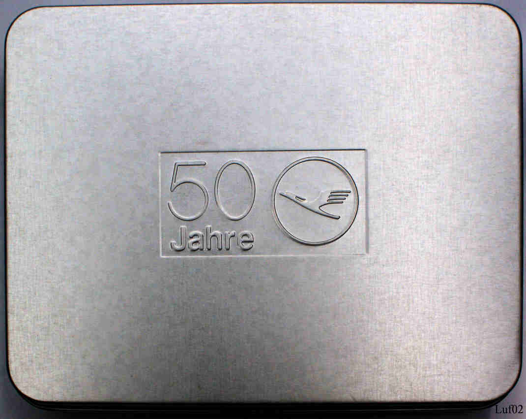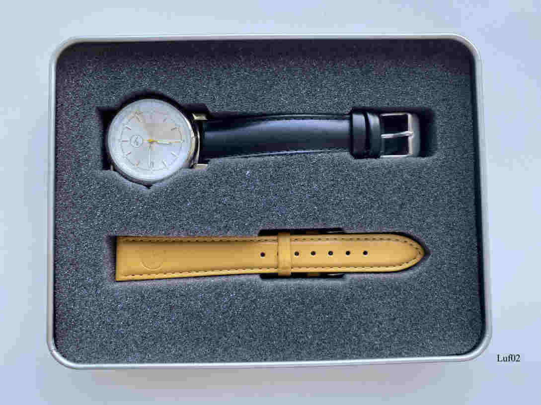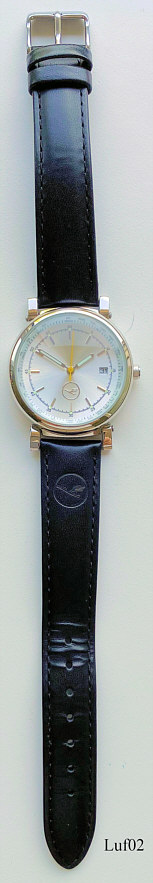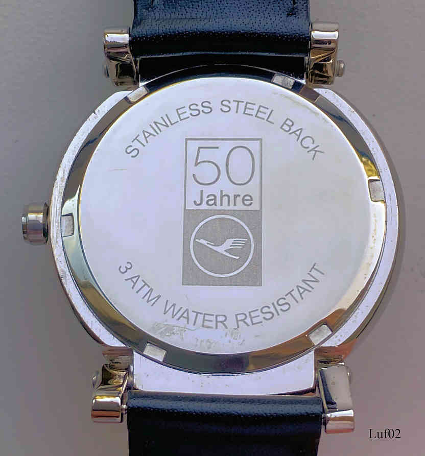 Eine Jubiläumsuhr der Deutschen Lufthansa anläßlich der 50 Jahr Feier der Wiederaufnahme des Flugverkehrs am 01.April 1955. Beschriftet vorn: LH Logo, innen: “No 0 Jewels, Unadjusted, Miyota Co, 2115, Japan”, hinten: ”Stainless Steel Back, 3 ATM Water Resistant, 50 Jahre, LH Logo”. Diese Uhr wurde den LH Mitarbeitern anläßlich des Jubiläums übergeben und war nicht im Handel erhältlich. Schwarzes Lederarmband, auswechselbar gegen ein gelbes Lederband mit LH Emblem, zusammen in einer Geschenkdose.