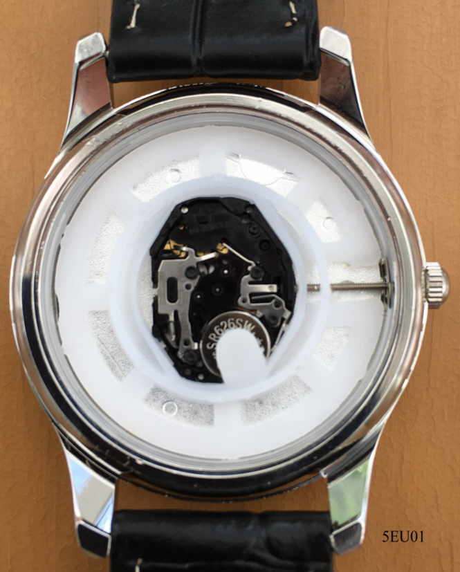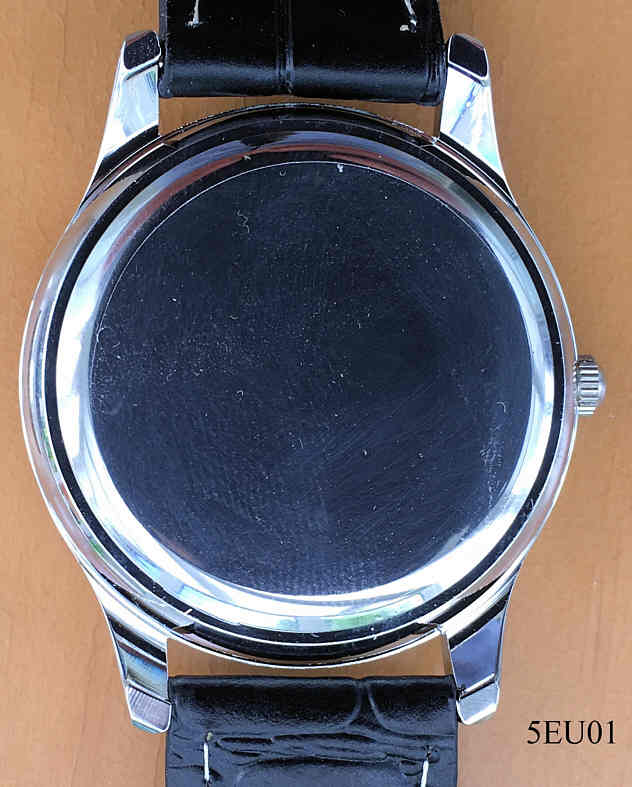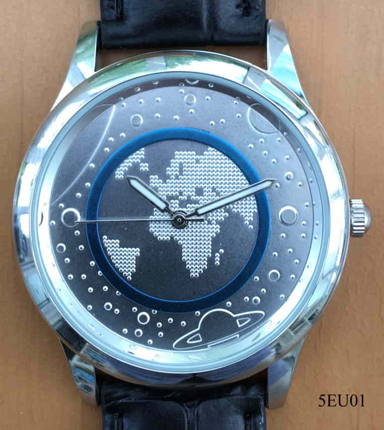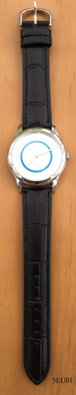 Dies ist eine einfache Quartzuhr zum Gedenken an die Ausgabe der ersten deutschen 5 Euro Münze mit einem transparenten blauen Kunststoff Ring 2016. Beschriftet vorn: ” ”, innen: ”SIIO, PC21S, Singapore, No 0 Jewels”, hinten: ” ”, Schwarzes Lederarmband. Wahrscheinlich wurde diese Uhr von der Firma “ Münzhandelsgesellschaft Deutsche Münze” in Auftrag gegeben.