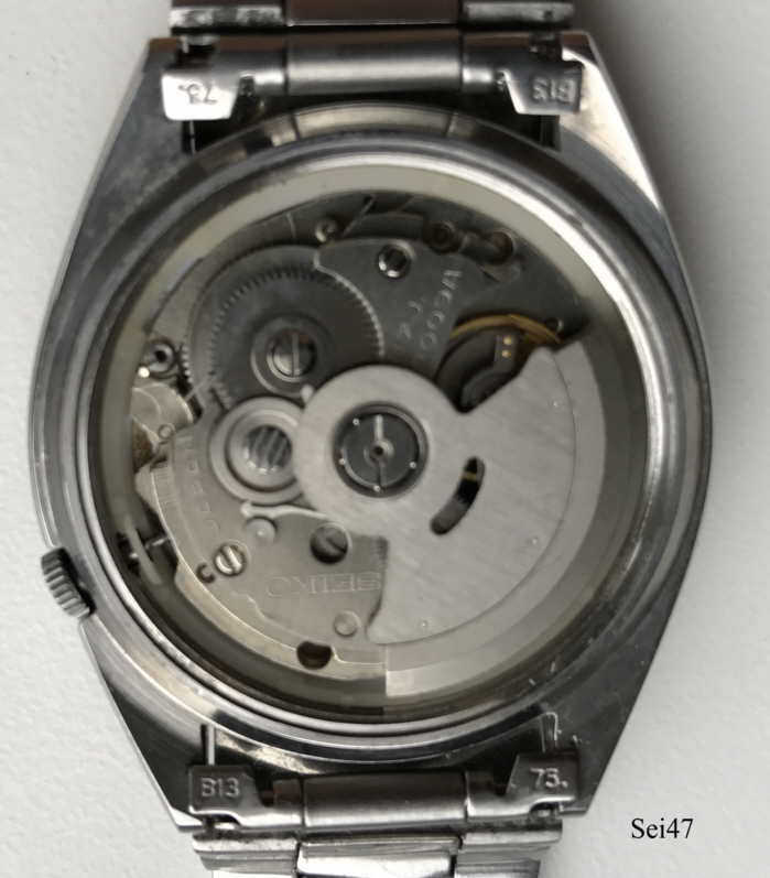 Dies ist eine Seiko 5 Automatik Uhr mit Edelstahl Gehäuse, guillochiertem weißen Zifferblatt und Day/Date Anzeige bei der 3. Beschriftung vorn:” SEIKO, 5, Automatic, 7009-405 R“, hinten: “Seiko, Water Resistant, 537220, Stainless Steel, KF, 7009- 3040 A”, innen: “Seiko Time Corp, 7009A, Seventeen Jewels”. Edelstahlgehäuse mit Edelstahl Boden.