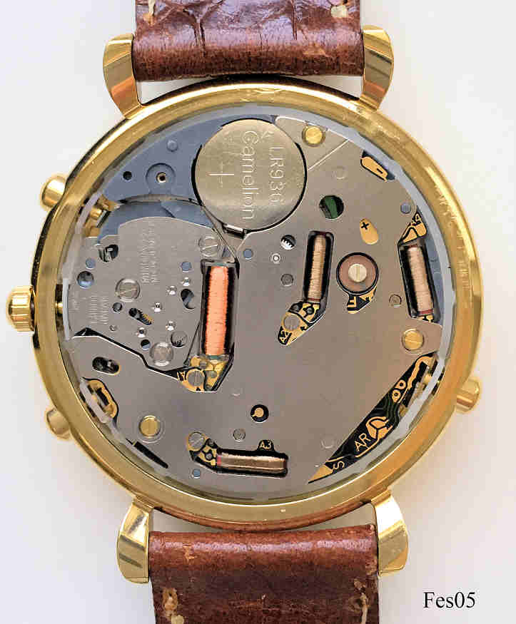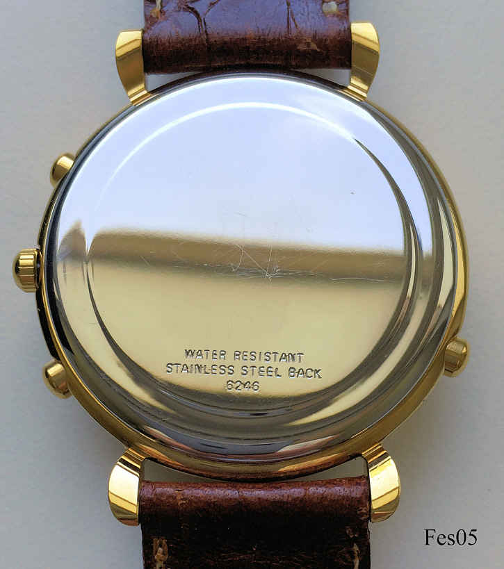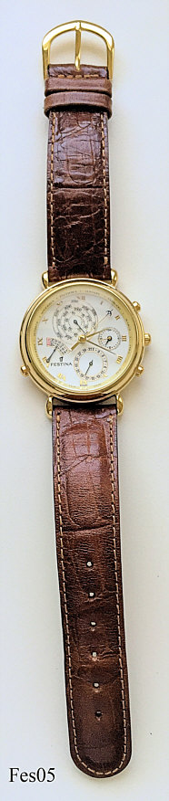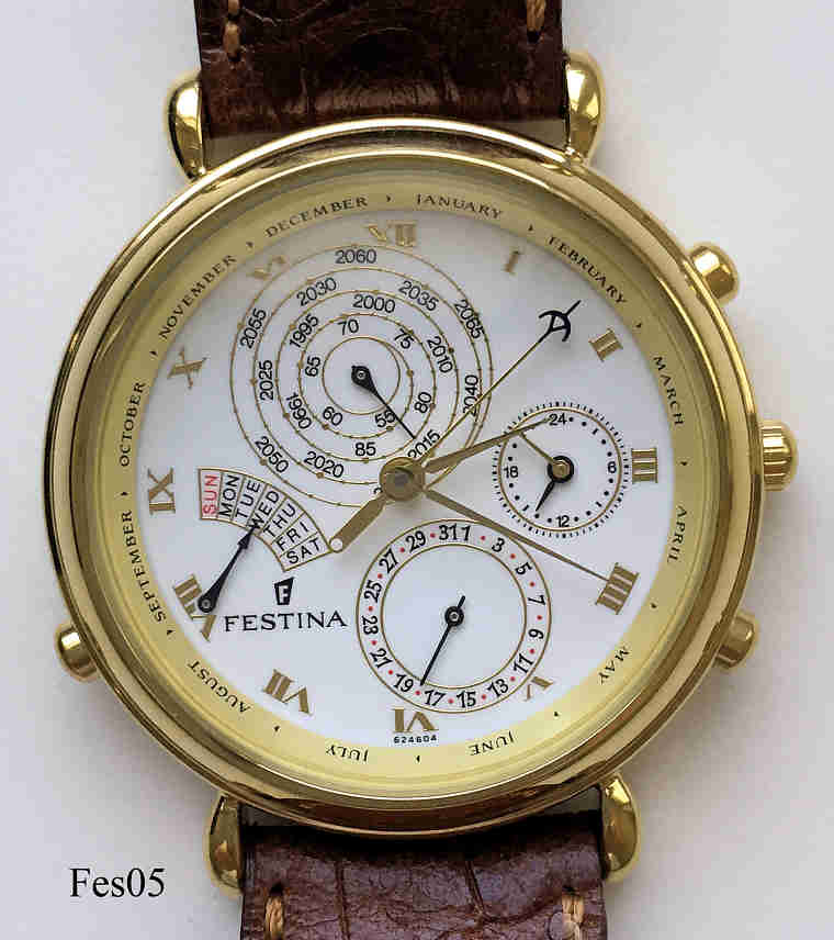 Eine Festina Uhr mit ewigem Kalender, weißem Zifferblatt und 4 Skalen. Bei der 12 ist die Jahreszahl von 1955 bis 2065, bei der 9 ist der Wochentag, bei der 3 ist die Sekunde und der 24 Stunden Anzeiger und bei der 6 ist das Tagesdatum. Auf dem Außenring wird über einen Zeiger der Monat angezeigt. Beschriftet vorn: “Festina, 624604”, hinten: ”Water Resistant, Stainless Steel Back, 6246”, innen: “Miyota Co., No 0 Jewels, 6U01, Japan”. Braunes Lederband.