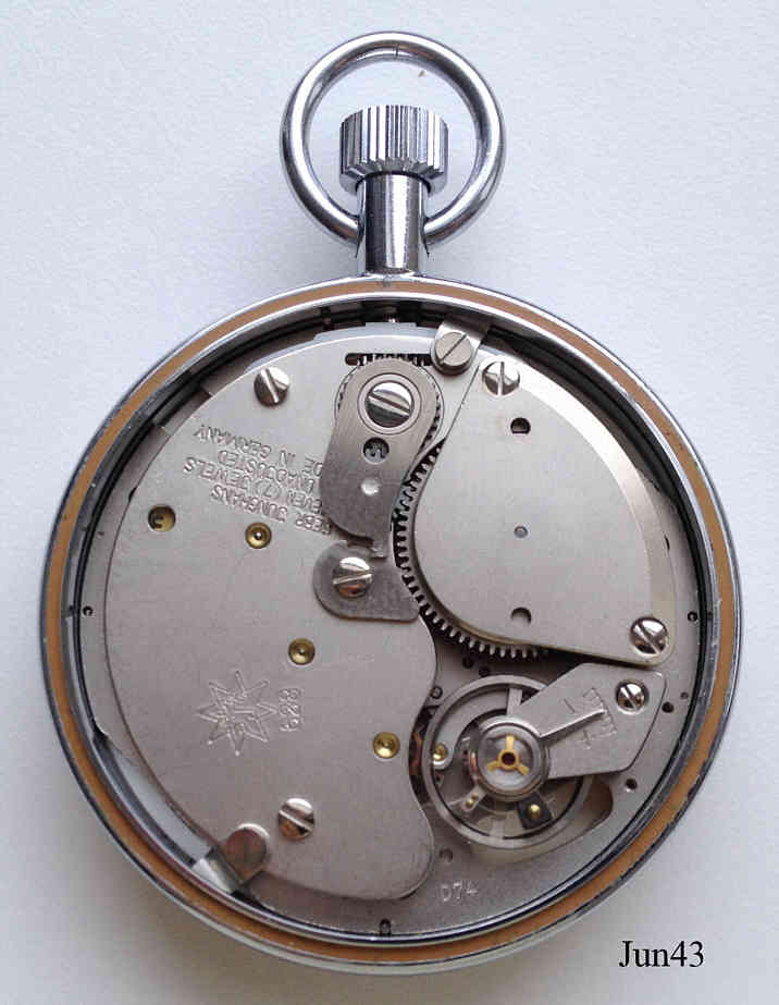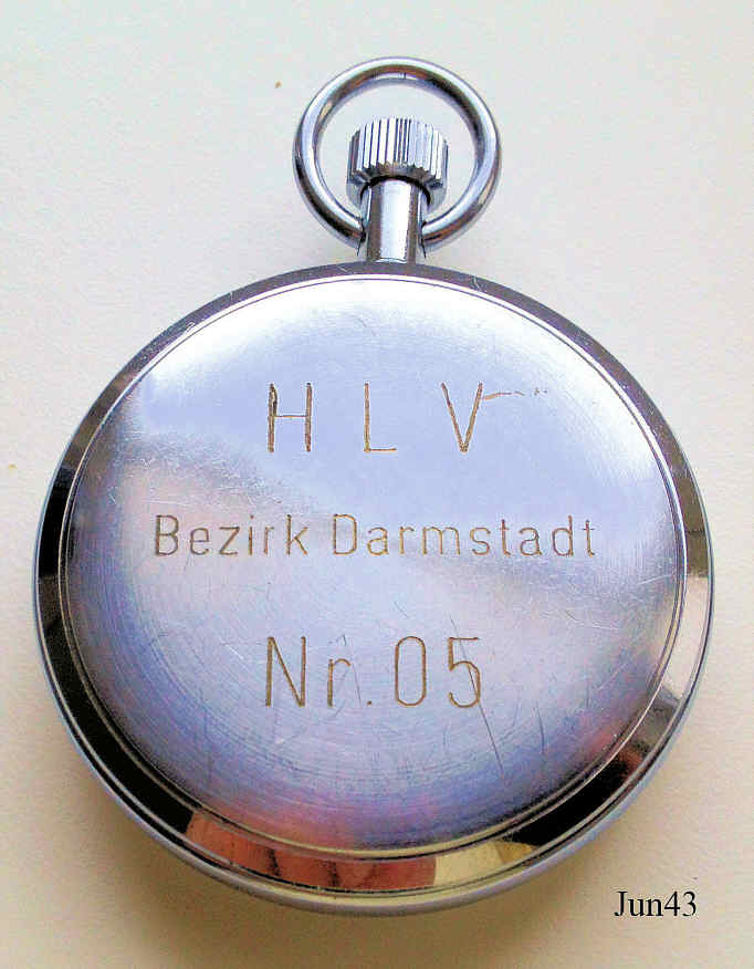 Eine Junghans Stoppuhr mit verchromtem Base Metal Gehäuse. Zeiger und Ziffern in schwarz, Zifferblatt cremefarben. Drei Skalen: Unten Mitte 1/10 Sec, oben rechts Sekunden, oben links Minuten. Beschriftet außen: “Junghans, Made in Germany”, Innen: ”Gebr. Junghans, seven (7) Jewels, Unadjusted, Made in Germany, 628, D74”, hinten: ”HLV, Bezirk Darmstadt, Nr. 05” Kaliber Junghans 628. Diese Stopuhr stammt aus dem Nachlass von Georg Born, Ehemaliger HLV Bezirksvorsitzender Bezirk Darmstadt, Träger des Bundesverdienstkreuzes