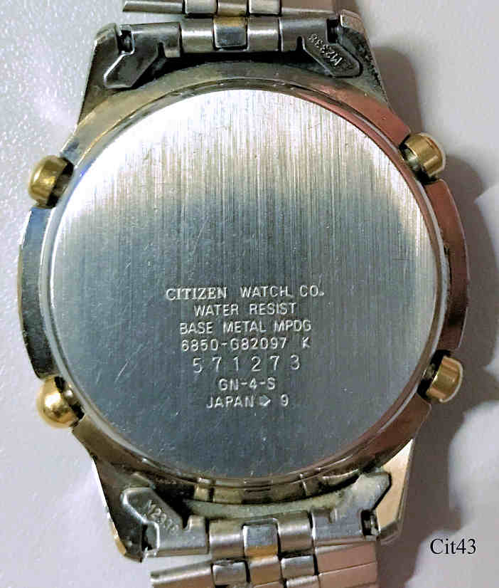 A Citizen Chronograph with sTitanium case and back. Caliber Citizen 6870A, Date at 3, signed front: “Citizen, Titanium, Chronograph, WR100“, back: “ Citizen Watch Co, Water.Resist Base Metal MPDG, 6850-G82097 K, 571273, GN-4-S, Japan->9”, inside: “Citizen Watch Co, No Jewels, 6870A, Japan”. Two colors Stainless band.