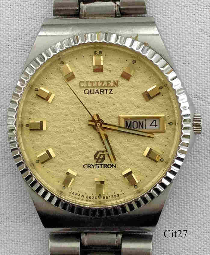 Dies ist eine Citizen Quartz Uhr, Modell Crystron mit dem 8620A Werk, Day/Date bei der 3. Beschriftet vorn: ”Citizen, Quartz, CQ, Crystron, Japan 8620-861393Y”, hinten: ”Citizen Watch Co, All Stainless Steel, 4-860837- TA, 60502166, 60-0679, GN-5-S,Japan”, innen: “Japan, Citizen, 8620A, 7J”