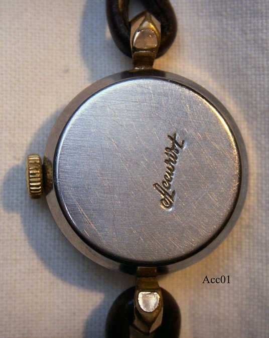 This is an Accurist ladies Handwind watch with gold case. Signed front: ”Accurist, 21 Jewels, Antimagnetic”, back: “ Accurist”, inside: “Accurist, 2 Adjustments, Swiss, 21 Jewels”. Case gold plated with fixed oars for the band.