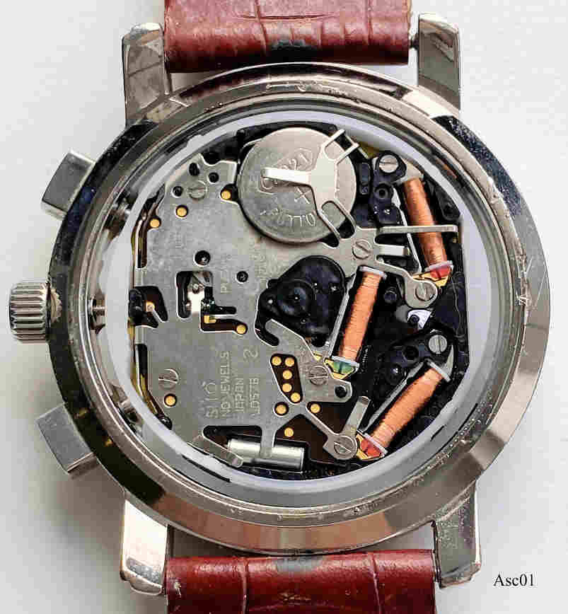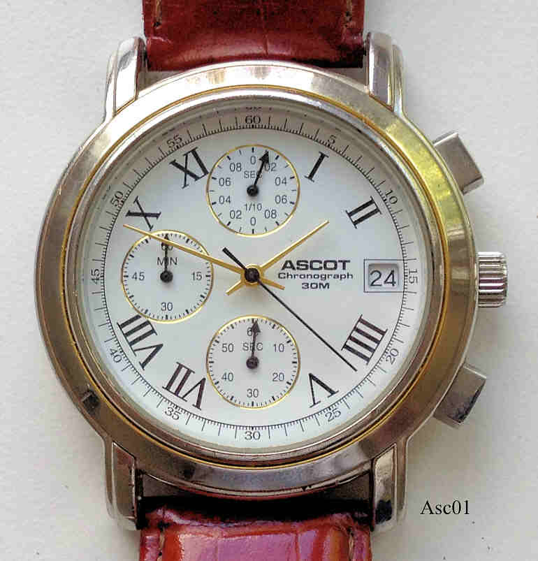 Ein Chronograph von Ascot mit römischen Ziffern auf dem Zifferblatt, Datum bei der 3. Beschriftet vorn: “Ascot, Chronograph, 30M”, hinten: ”Ascot, Design, Serie 1002, 07-1282, Stainless Steel Back, 30M Water Resistsant”, innen: “SIIO, No Jewels, Japan, VD57B” . Braunes Lederarmband, Kaliber SIIO VD57B