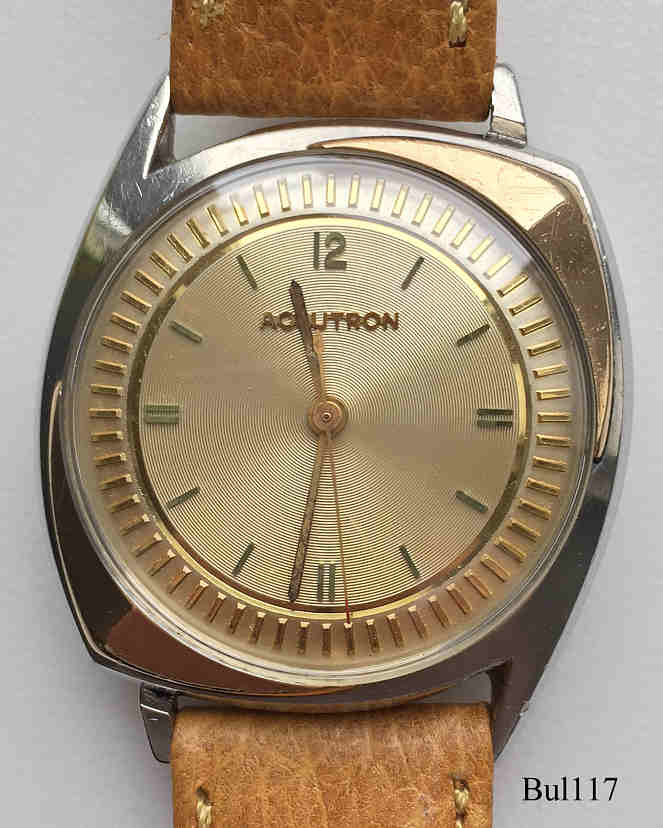 Eine Bulova 214 mit asymmetrischem Edelstahlgehäuse, Beschriftet hinten: “BULOVA, Waterproof, Patented, 120393, M0”, innen: “Bulova, 214, USA, Pat.:2.971.323, M1”, Caliber 2140, Herstelldatum 1960 (M0), verschraubter Boden, Einstellung über Stellring an der Rückseite, hier noch die erste Version mit Arretierung. Hellbraunes Bulova Lederarmband.