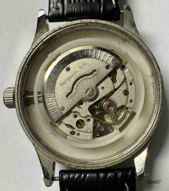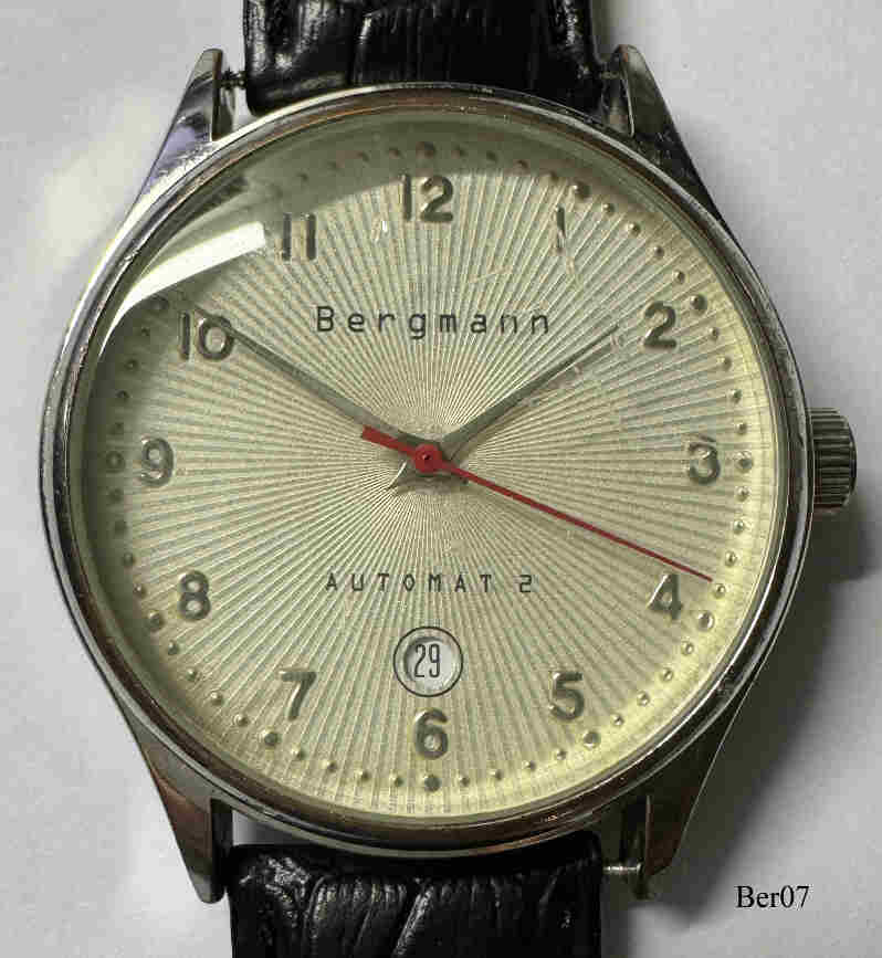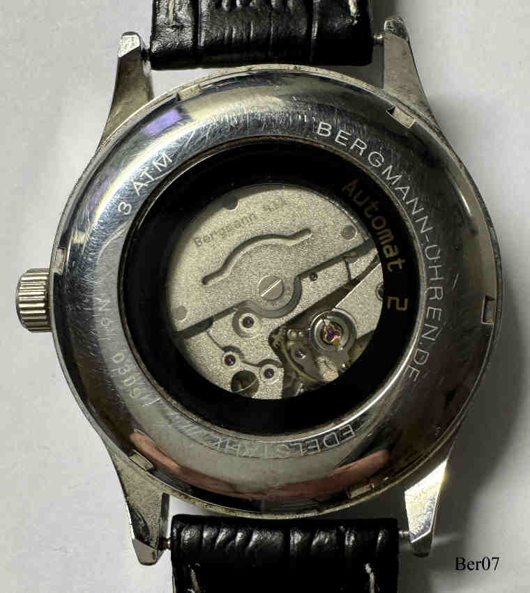 Dies ist eine Bergmann Automat 2, Datum bei der 6, Nr. 0309,. beschriftet vorn: ”Bergmann, Automat 2”, hinten: ”Automat, Nr. 0309, Bergmann-Uhren.de, AC, Automat 2”, innen: ”Bergmann 411”. Gehäuse Edelstahl, Glasboden, hellbeiges Zifferblatt, schwarzes Lederarmband. Kaliber unbekannt.