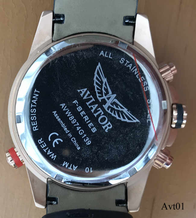 Ein Chronograph von Aviator mit Stabindexen und 24 Std. Anzeige auf dem Zifferblatt, Datum bei der 3. Beschriftet vorn: “Aviator, F-Series”, hinten: ”Aviator, F-Series, AVW8974G139, Assembled in China, All Stainless Steel, 10ATM Water Resistsant”, innen: “SIIO, No Jewels, Japan, VD570”. Tachymeterring außen, mit dem roten Knopf wird der innenliegende Städtering verstellt. Schwarzes Lederarmband